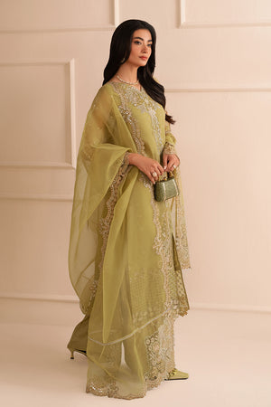 This exquisite organza shirt features delicate embroidery work, highlighted by intricate tilla and sequin details. The design is further elevated with laser-cut work along the daman borders, adding a touch of sophistication. The ensemble is paired with a plain raw silk trouser and complemented by an organza dupatta, which is adorned with finely embroidered pallus and borders, creating a harmonious blend of elegance and tradition.