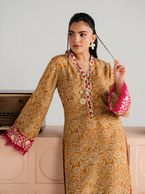 A refreshing Mustard printed lawn ensemble featuring a beautifully designed shirt and matching trouser. Paired with a lightweight chiffon dupatta that adds a soft, graceful finish. Perfect for effortless everyday elegance.