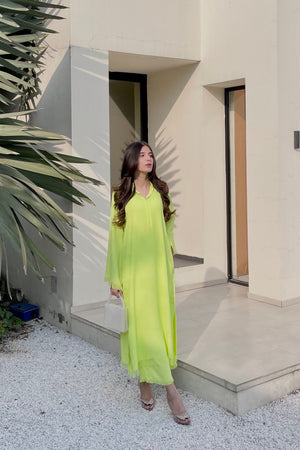 Presenting our  supper hot Neon Colour  Long Elegant Shirt, a timeless addition to your wardrobe. This shirt exudes understated sophistication with its classic design and versatile neon green yellow shade. Tailored for a graceful silhouette, it offers a perfect blend of comfort and style with threaded Hand Work on shirt ,sleeves and trouser.This long shirt and Cullotes effortlessly transitions from day to night. Elevate your fashion with this wardrobe staple that embodies elegance in every detail.