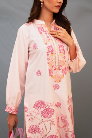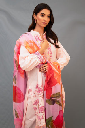 Adorned with unique laces and buttons, contrasting resham work, & a beautifully colored digital printed dupatta, this pastel ensemble is bound to look graceful.