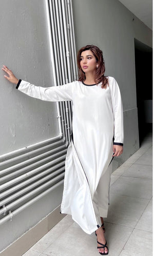 Experience the ultimate sophistication with our White Basic two pc outfit. Made from premium imported Korean Georgette fabric, this piece features a unique black strip design and is crafted from a special non-see through fabric. Perfect for any occasion, give your wardrobe the upgrade it deserves with Manahils By ALLECHANT Clothing.