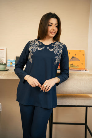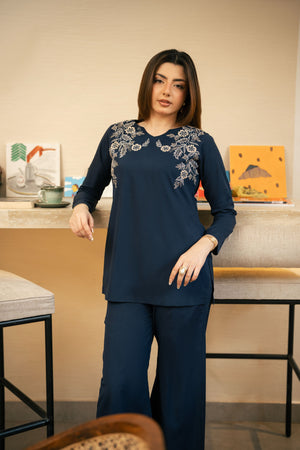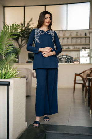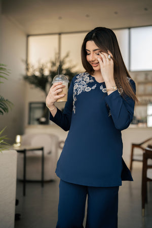 This navy set leans into quiet confidence. The kurta holds a clean, relaxed shape, accented with fine floral embroidery across the neckline. Matched with flowing trousers, the look stays cool, composed, and easy, polished without trying too hard.