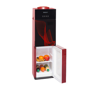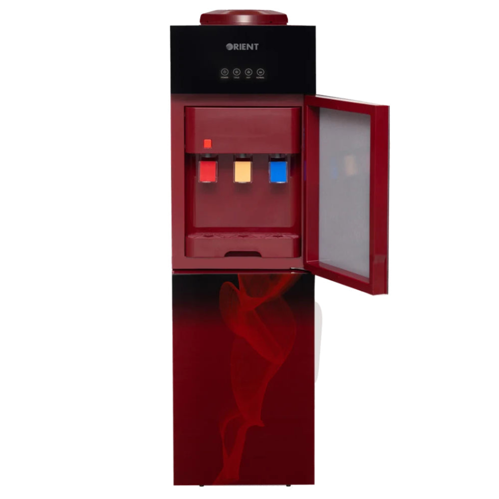 The Orient Crystal 3 Taps Red Glass Door Water Dispenser is a stylish and functional water dispenser designed to meet your daily water consumption needs. It offers hot, cold, and room temperature water options, and features a built-in refrigerator. The child safety lock provides added safety, especially for households with children.