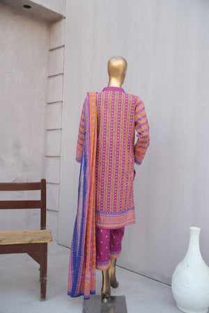 The Oswah Woman outfit, a part of the Pre-Winter Collection, includes 03 pieces made of Cambric fabric (a type of fine, lightweight cotton). This ensemble features a printed suit with a dupatta (a long scarf) and matching printed trousers.