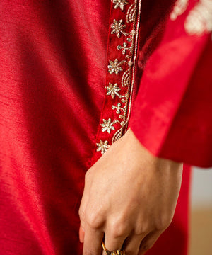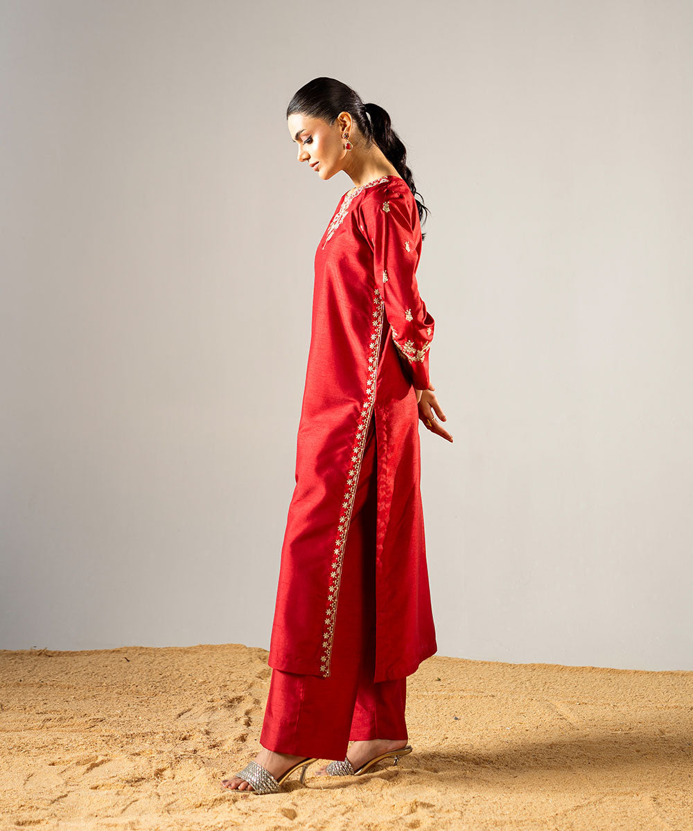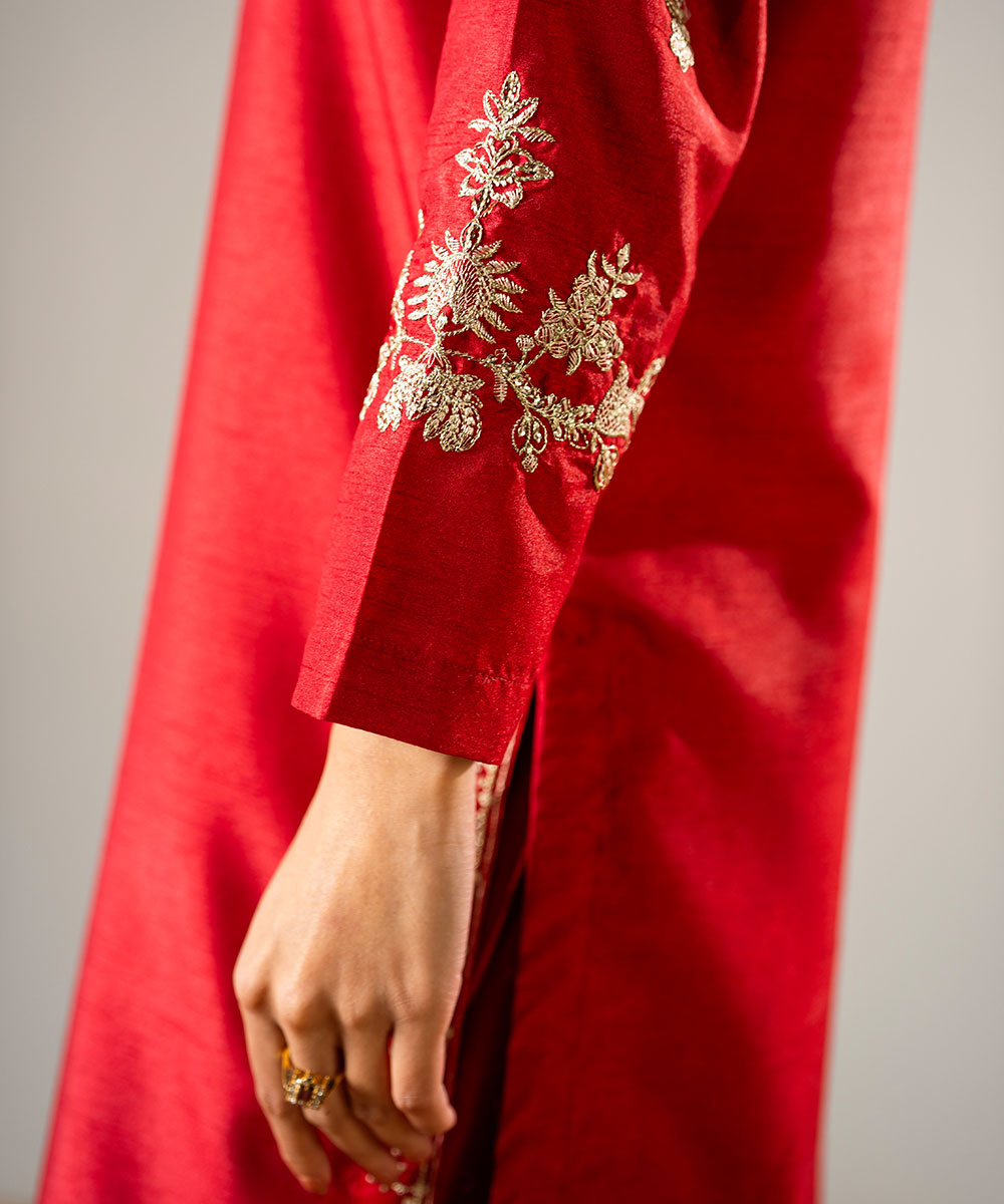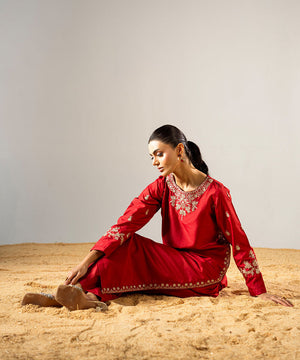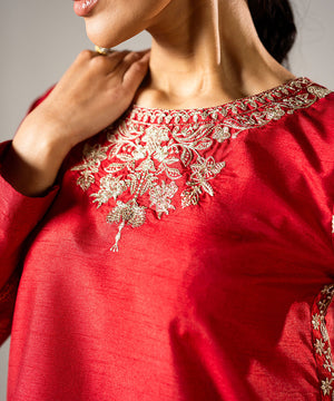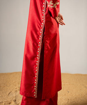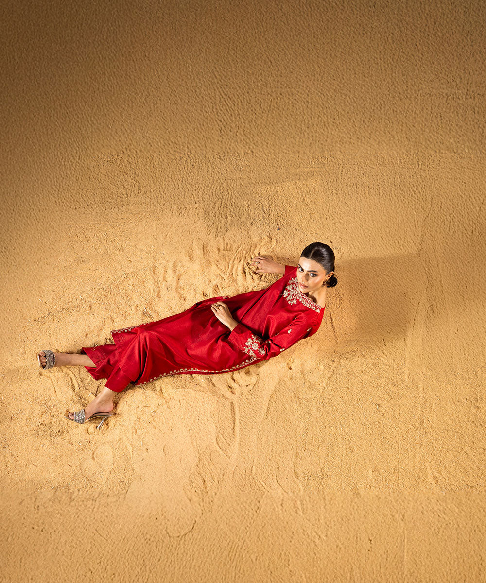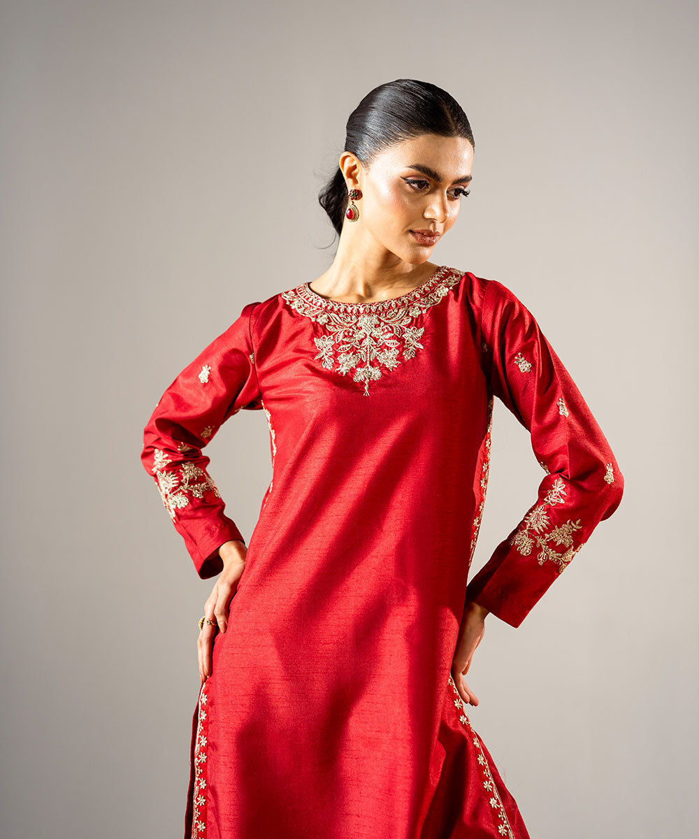 Description: This stunning red raw silk outfit features a beautifully embroidered neckline and hemline, crafted according to the latest trending designs. The sleeves are adorned with delicate embroidery, adding a subtle yet elegant touch. The ensemble perfectly balances contemporary style with traditional craftsmanship. Ideal for festive occasions or special gatherings, it radiates sophistication and timeless charm.