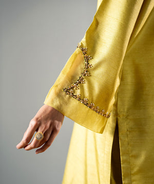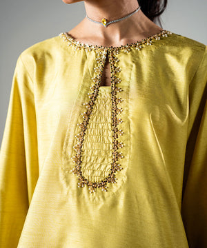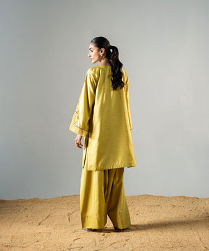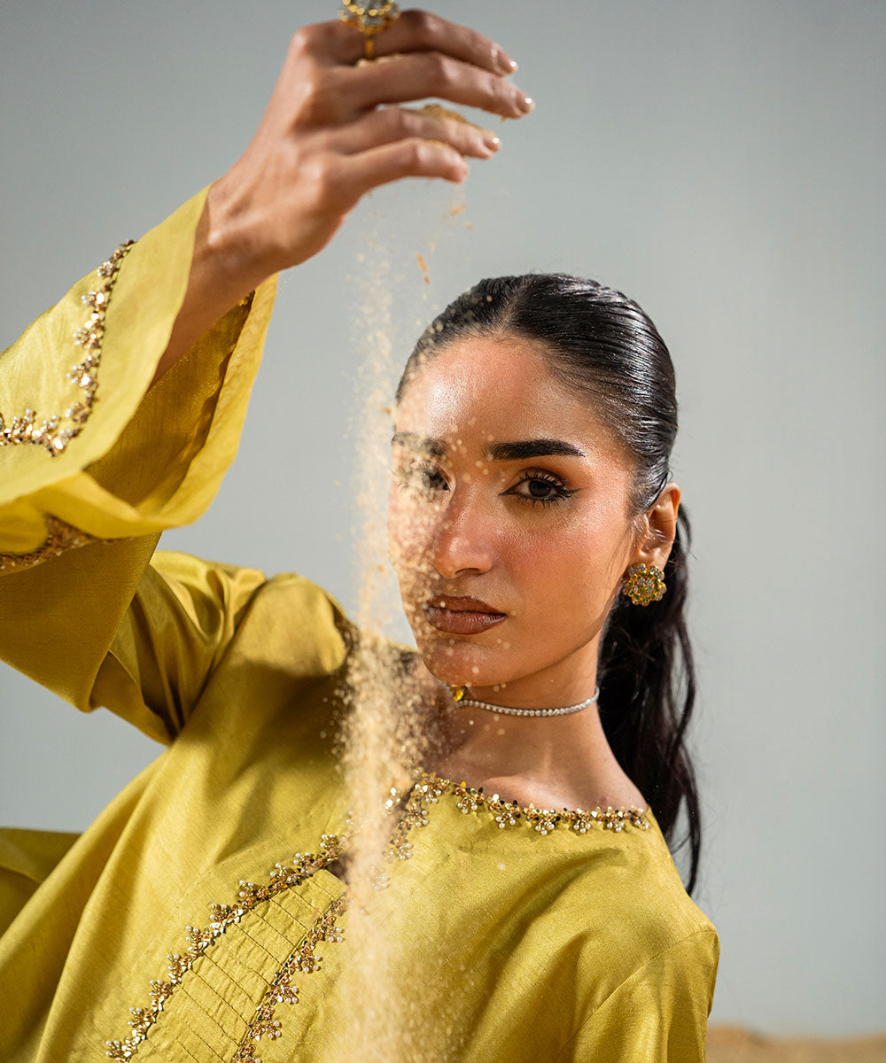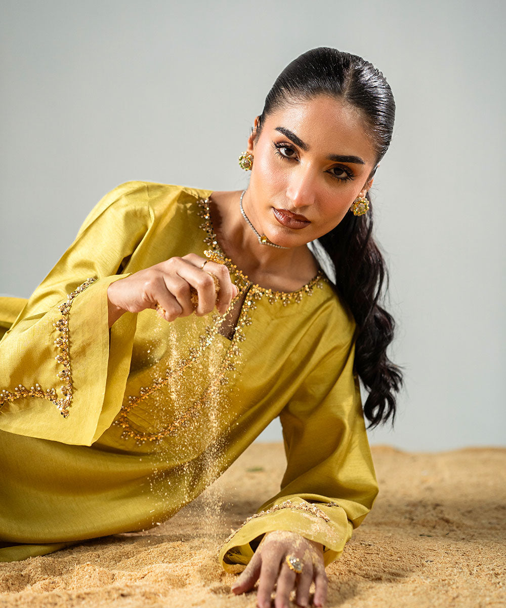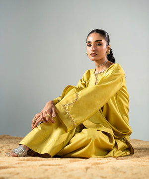 Description: This two piece olive raw silk ensemble features a delicate ada-work neckline, adding subtle elegance and charm.The sleeves are adorned with matching ada work, enhancing the overall detailing and charm. Added organza on the sleeves brings a soft, graceful finish to the design. Paired with a flowing farashi shalwar, the outfit is designed to elevate the overall look with fluid movement and sophistication. Perfect for festive occasions or special gatherings, it blends luxury with timeless charm.