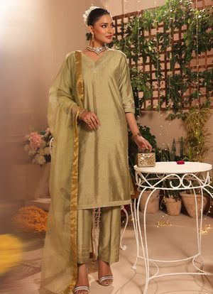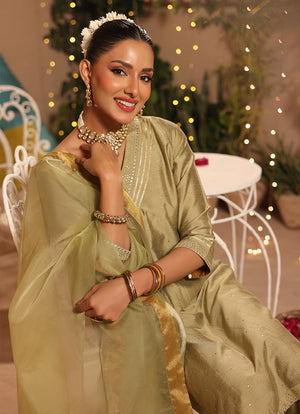 • Design: Fancy Organza Dupatta with Mukesh Embellished Cotton Silk Shirt & Trouser