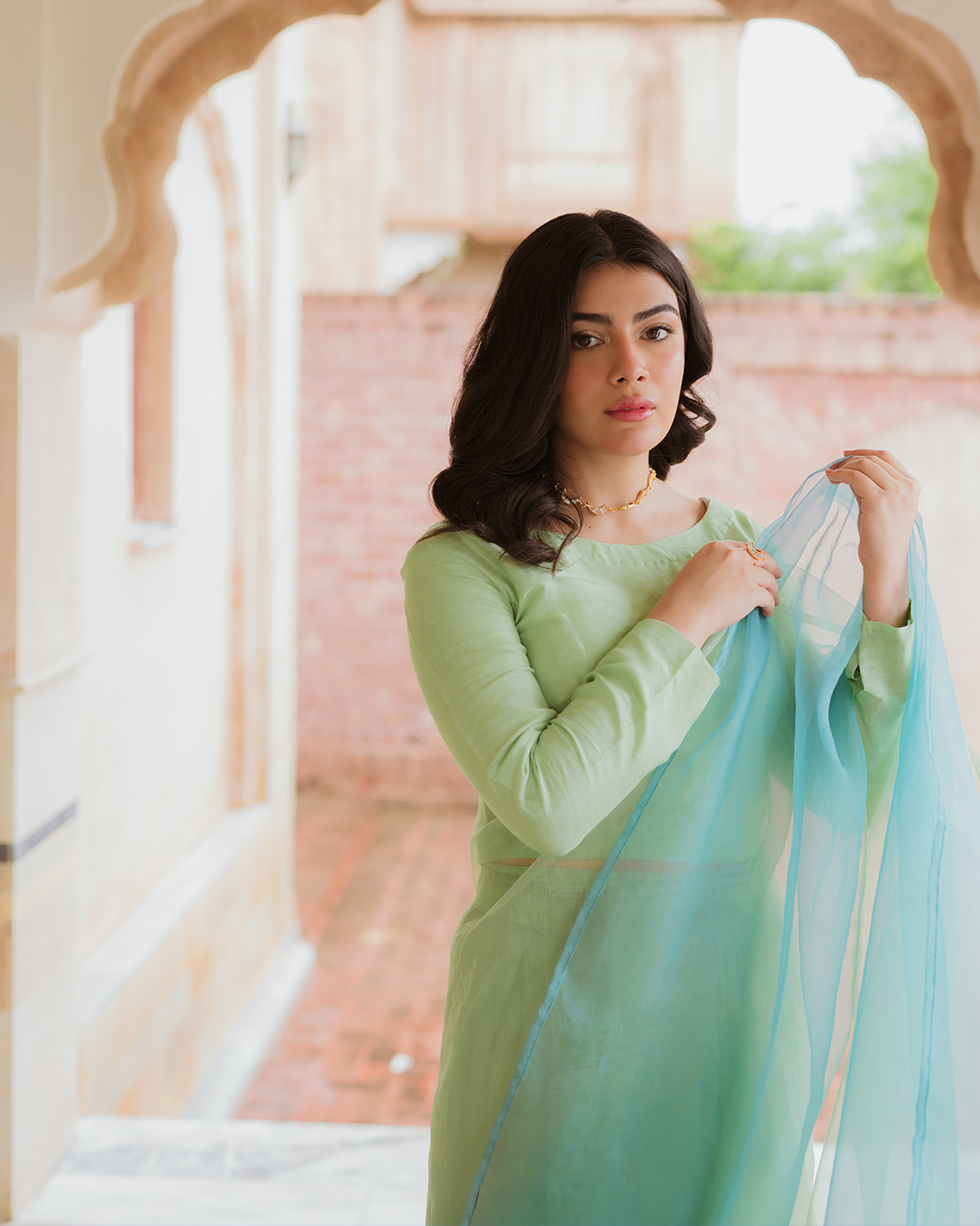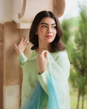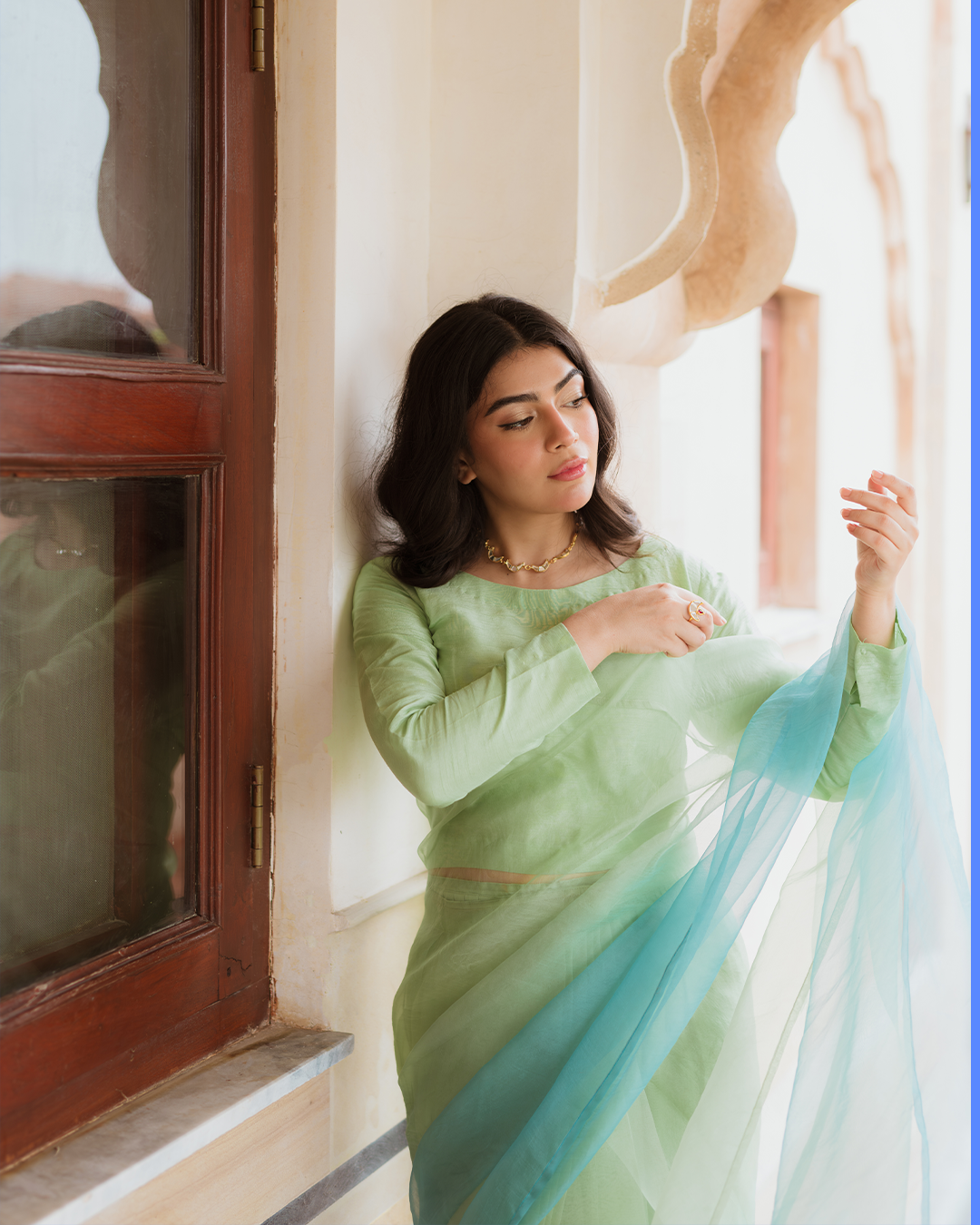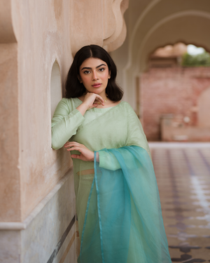 Flowing like a gentle stream, ‘Abshaar’ is a serene Mint Green Ombré saree that captures the essence of calm and grace. Expertly ombre-dyed to create a seamless gradient of soothing colors, this saree is paired with a perfectly coordinated petticoat and blouse for a complete and cohesive look. The harmonious blend of hues enhances the saree's elegant drape, making it a symbol of tranquility and refined beauty. Perfect for those who appreciate both sophistication and serenity in their attire.