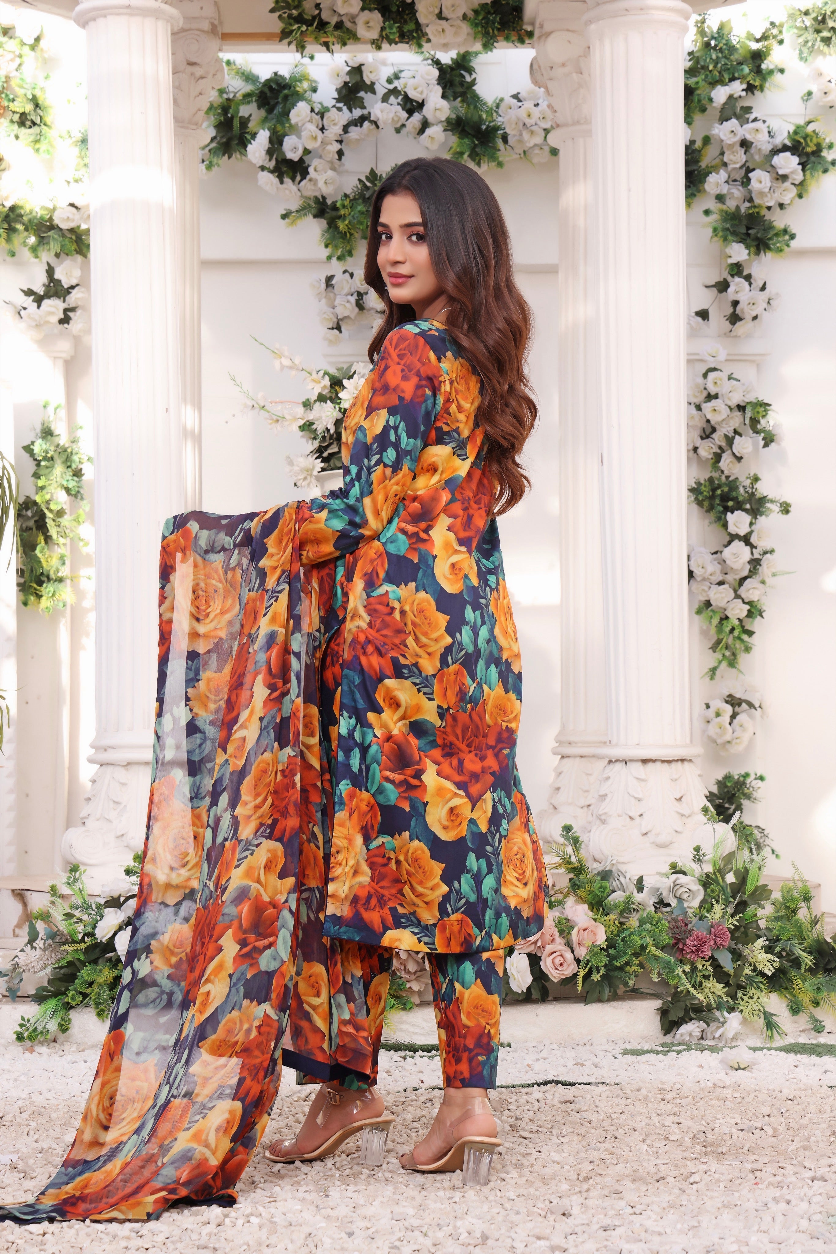 The article includes:Unstitched 3PCDigital Printed Shirt 3 yardsDigital Printed Chiffon Dupatta Digital Printed Trouser 2.5 yards
