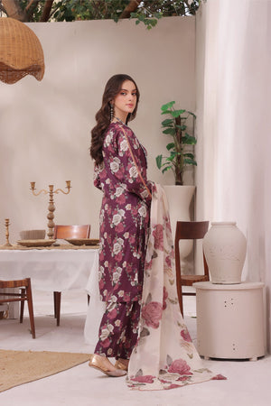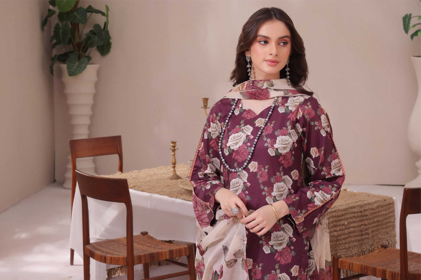 The article includes:Unstitched 3PCDigital Printed Shirt 3 yardsDigital Printed Chiffon Dupatta Digital Printed Trouser 2.5 yards