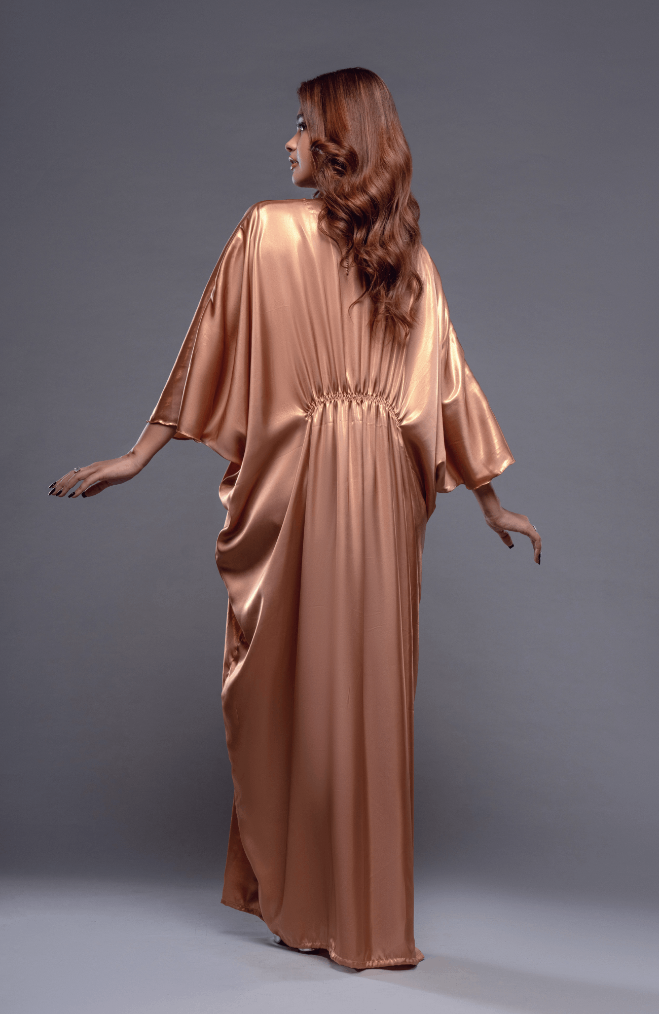 This exquisite copper kaftan, made from luxurious satin silk, showcases a graceful flowing silhouette. Adorned with intricate handwork on the neckline and a striking brooch, it effortlessly combines timeless elegance with modern sophistication, making it perfect for any special occasion.