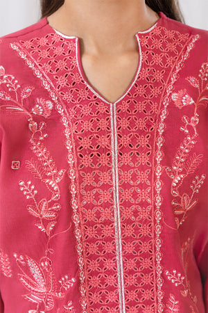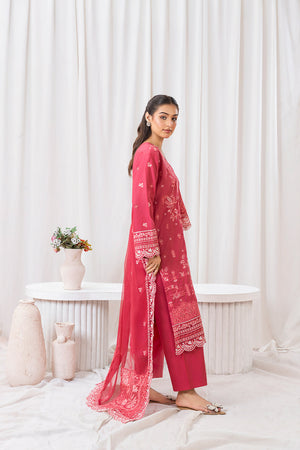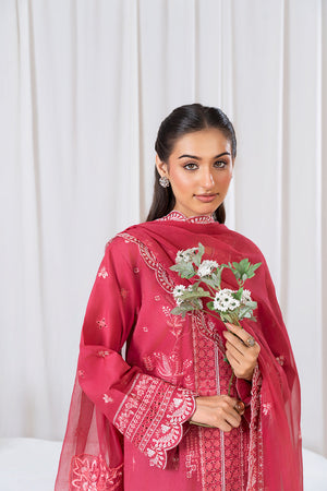 A 3-piece stitched ensemble crafted from premium quality cotton fabric, designed for comfort and festive sophistication. The set includes a long straight shirt adorned with intricate and detailed embroidery on the front and sleeves, paired with a matching embroidered dupatta for a refined traditional look. The outfit is completed with a straight plain trouser, offering a clean and modern silhouette that balances the ornate design of the shirt and dupatta.