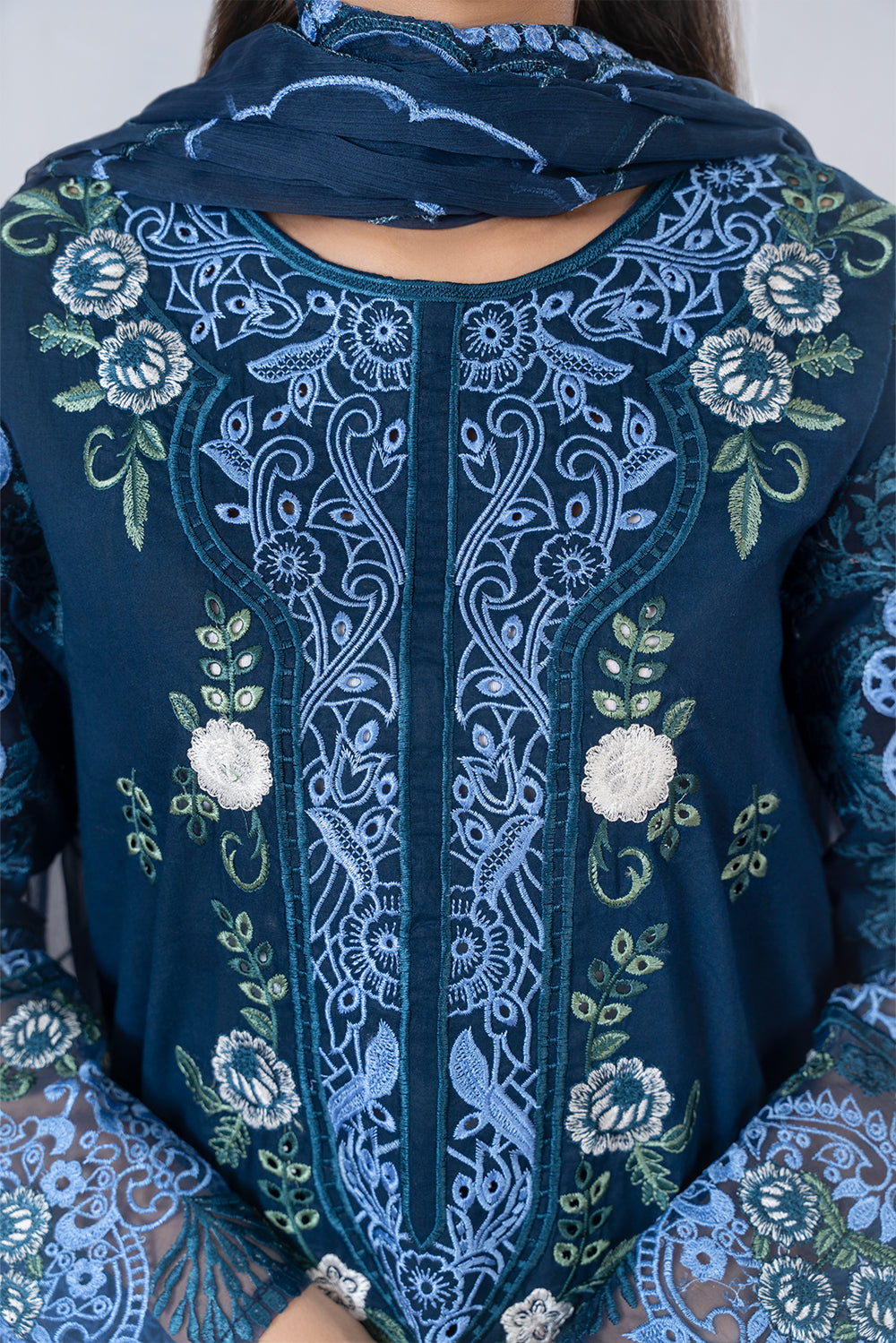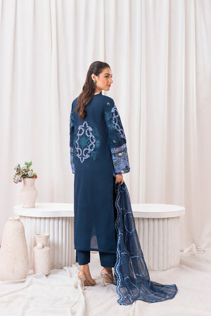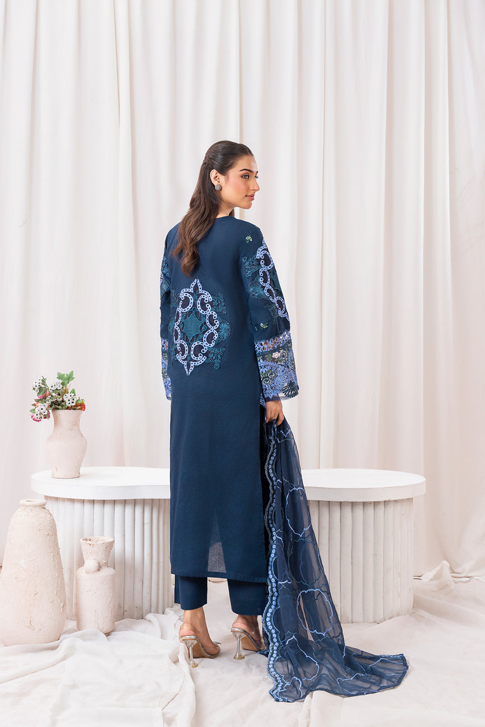 A 3-piece stitched ensemble crafted from premium quality cotton fabric, designed for comfort and festive sophistication. The set includes a long straight shirt adorned with intricate and detailed embroidery on the front and sleeves, paired with a matching embroidered dupatta for a refined traditional look. The outfit is completed with a straight plain trouser, offering a clean and modern silhouette that balances the ornate design of the shirt and dupatta.