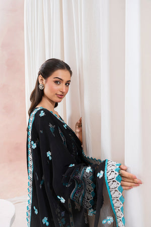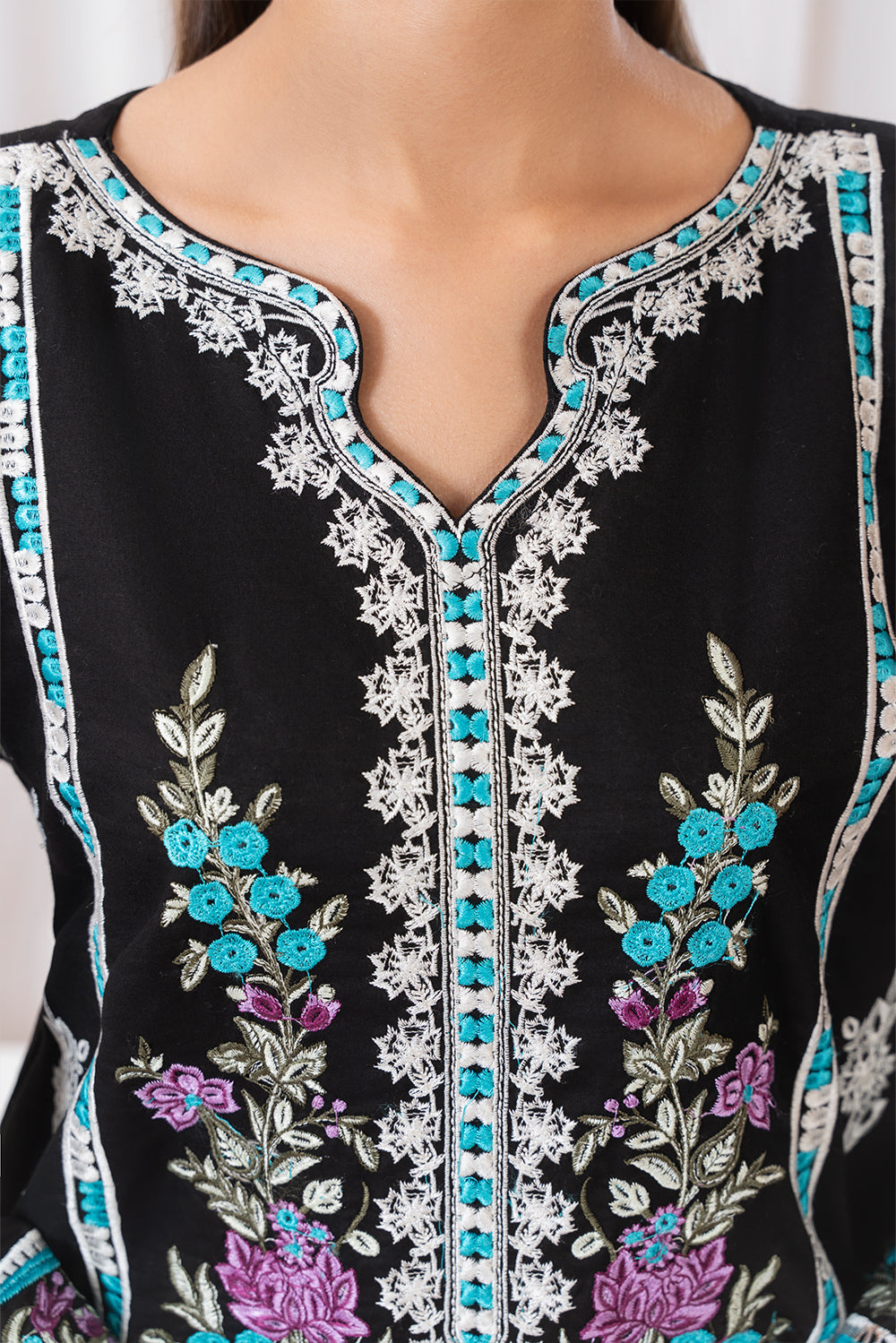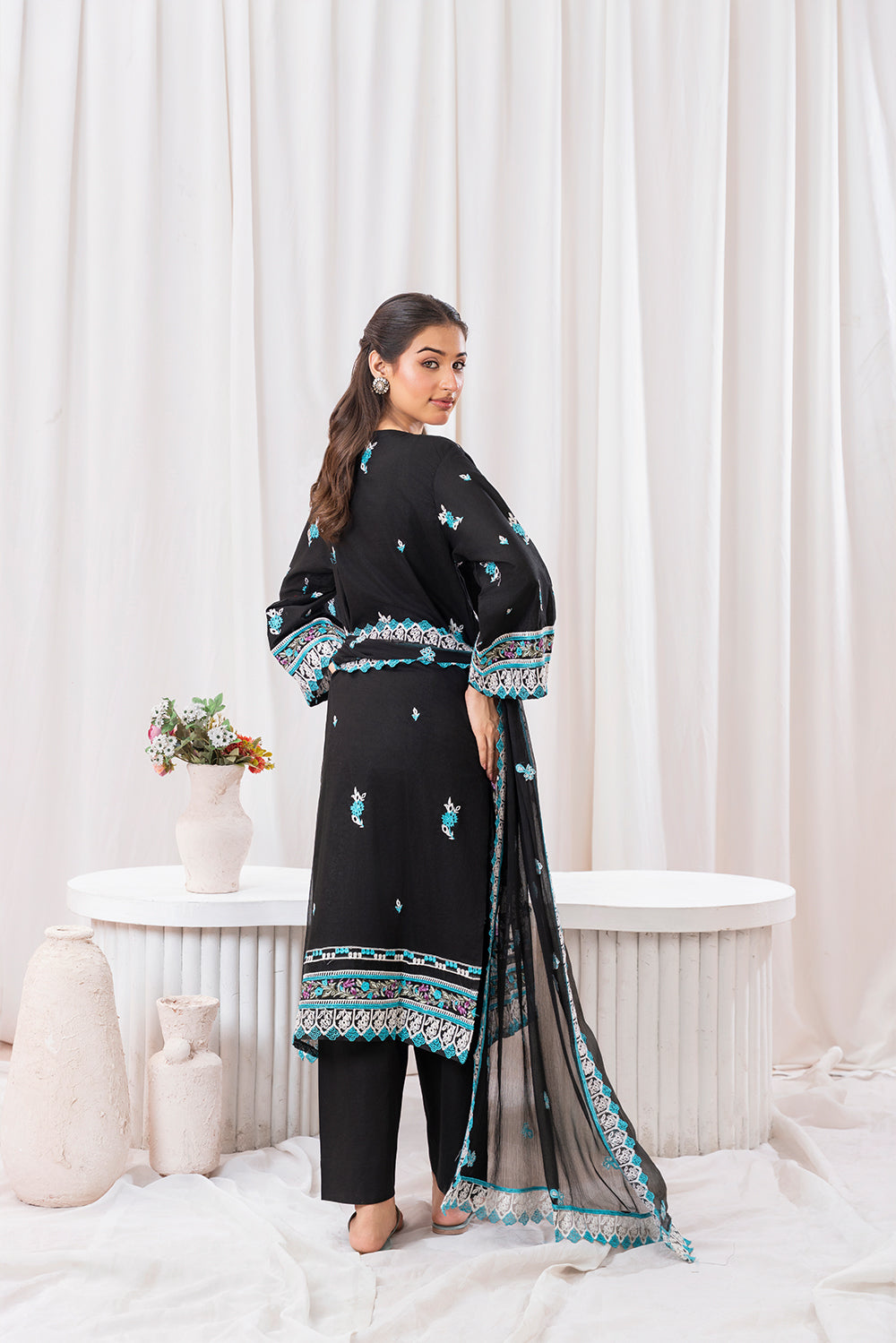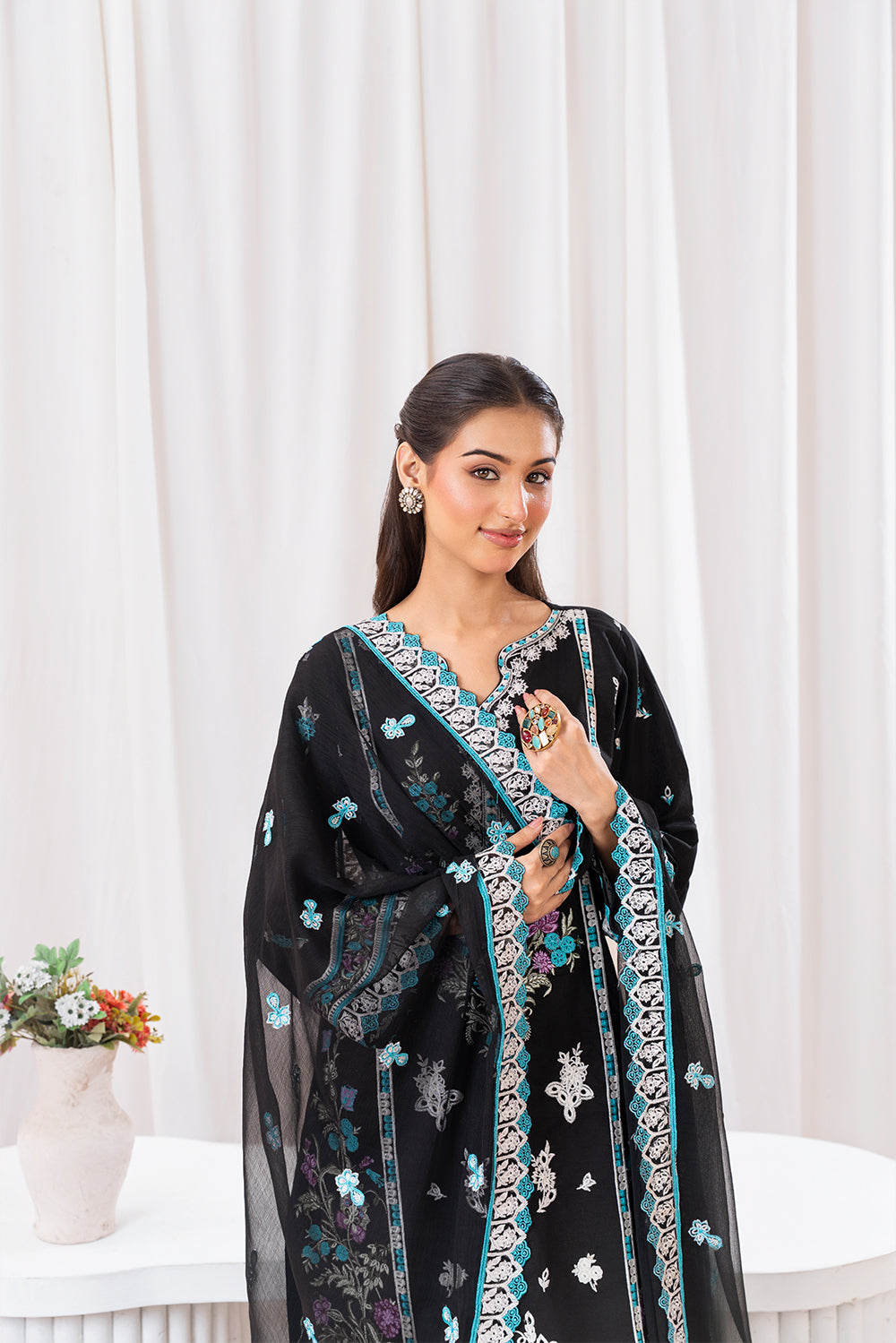 A 3-piece stitched ensemble crafted from premium quality cotton fabric, designed for comfort and festive sophistication. The set includes a long straight shirt adorned with intricate and detailed embroidery on the front and sleeves, paired with a matching embroidered dupatta for a refined traditional look. The outfit is completed with a straight plain trouser, offering a clean and modern silhouette that balances the ornate design of the shirt and dupatta.
