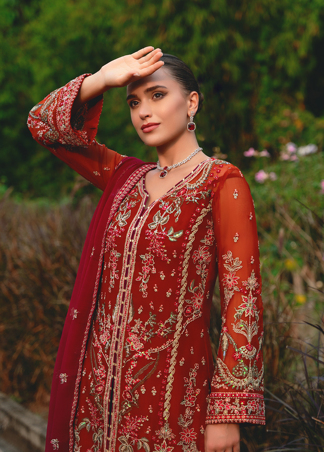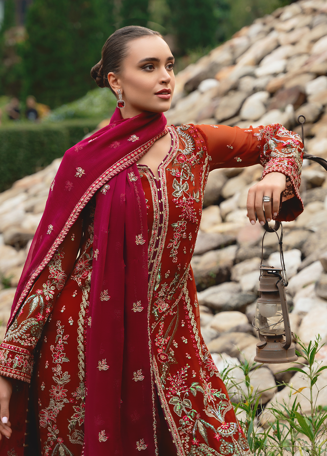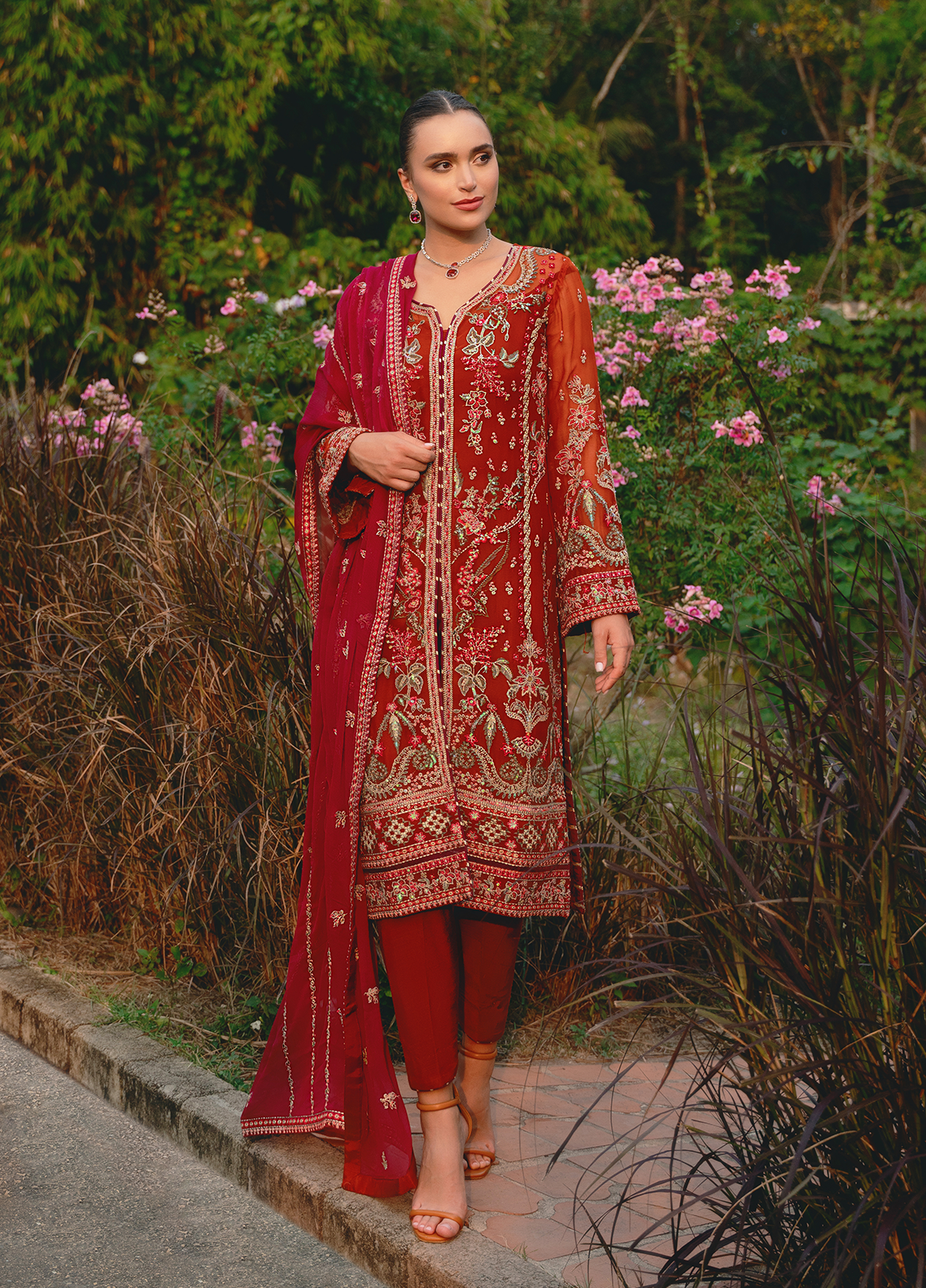 Athena'?he pinnacle of luxury and loyalty. This ensemble epitomizes elegance with its exquisite embroidery, with flowers and vines. Paired with a fully embroidered deep red dupatta boasting intricate borders on all sides, and elegantly completed with a tonal trouser.