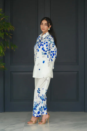 The radiant ensemble offers a unique and stylish look for any special occasion. This 2-piece suit features a chic contemporary short shirt with minimal floral prints. The matching trousers make it a trendy outfit to style at fun gatherings.