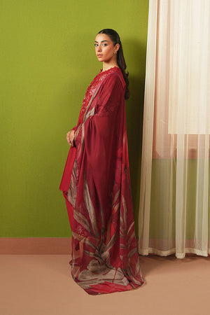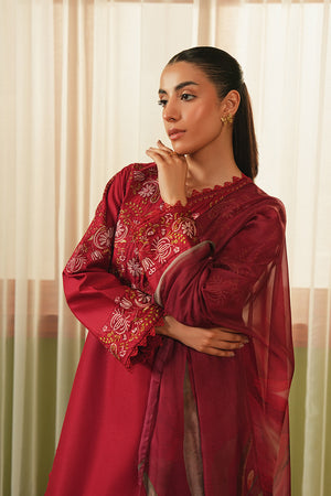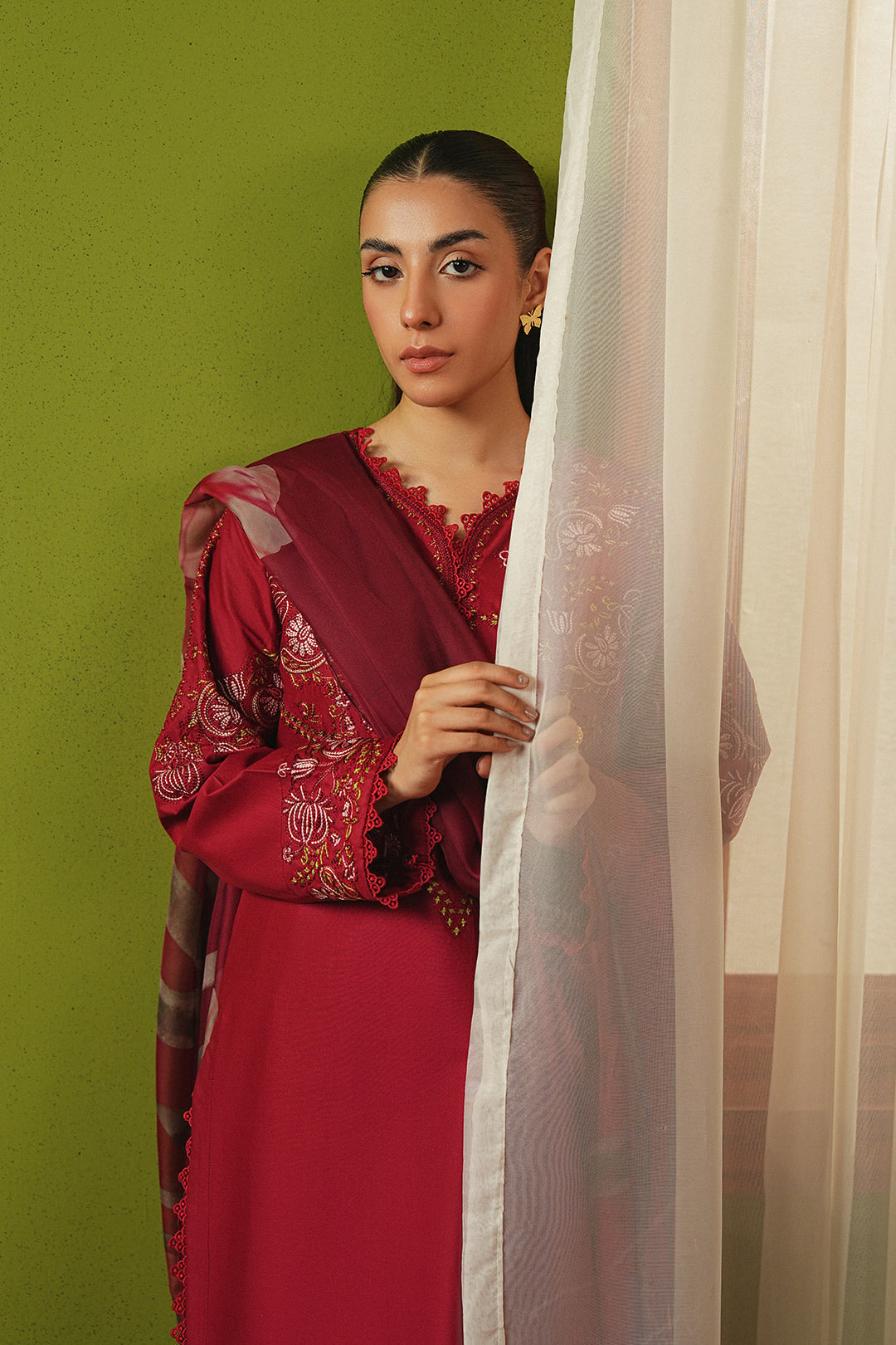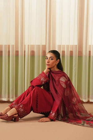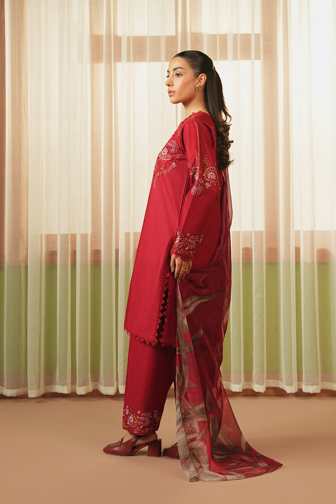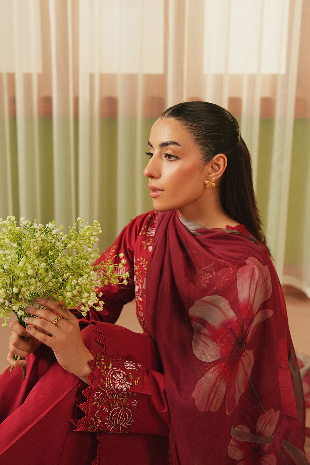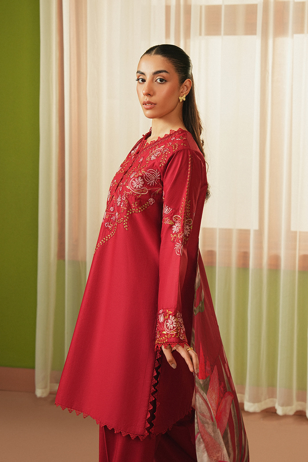 Elevate your style with Flare, a stunning red outfit made with soft lawn fabric. Featuring a farshi shalwar and embroidered silk dupatta, this ready-to-wear piece exudes sophistication and is perfect for festive and semi-formal occasions. Shine bright in this exclusive and elegant design.
