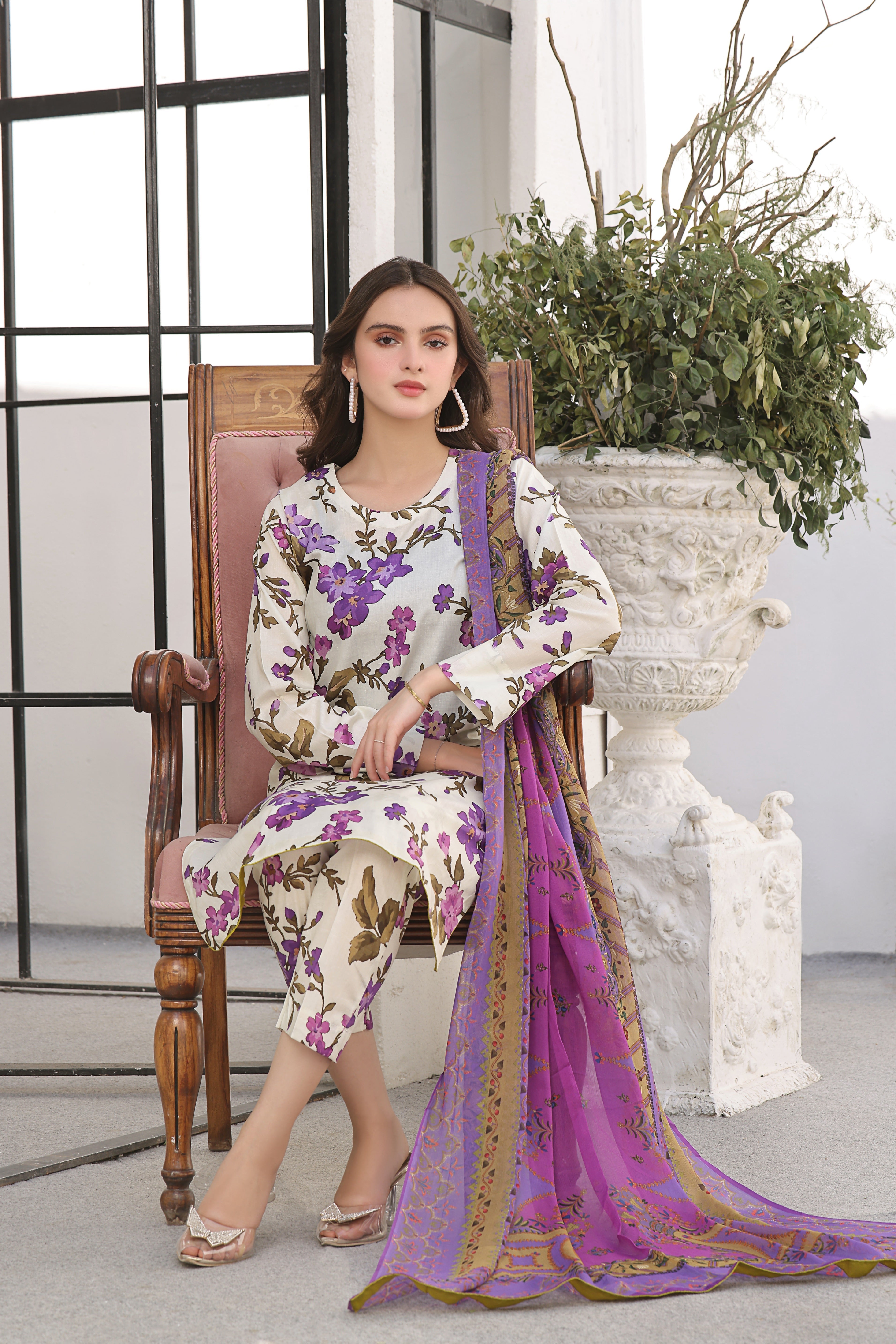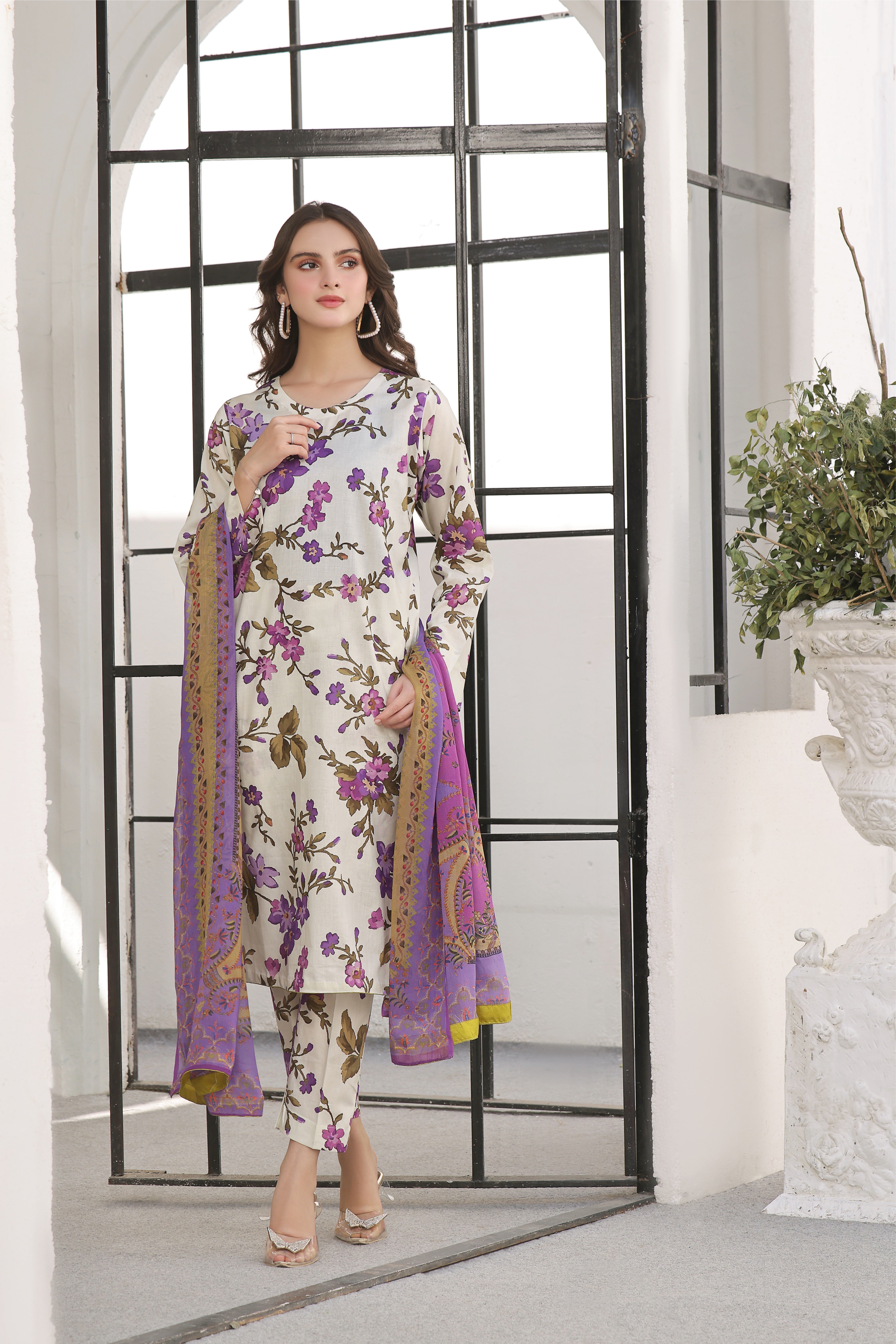 Experience ExquisitelyThis dress is for a new go this summer.The article includes:Unstitched 3PCDigital Printed Shirt (3 yards)Digital Printed Trouser (2.5 yards)Digital Printed Chiffon Dupatta (2.5 yards)Fabric Type: Lawn