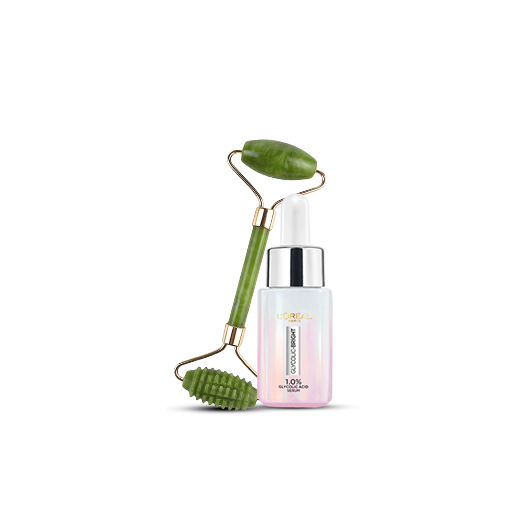 Bundle - Facial Beauty Jade Rollers for Face - Facial Massage Tool + L'Oreal Paris Glycolic Bright Instant Glowing Face Serums