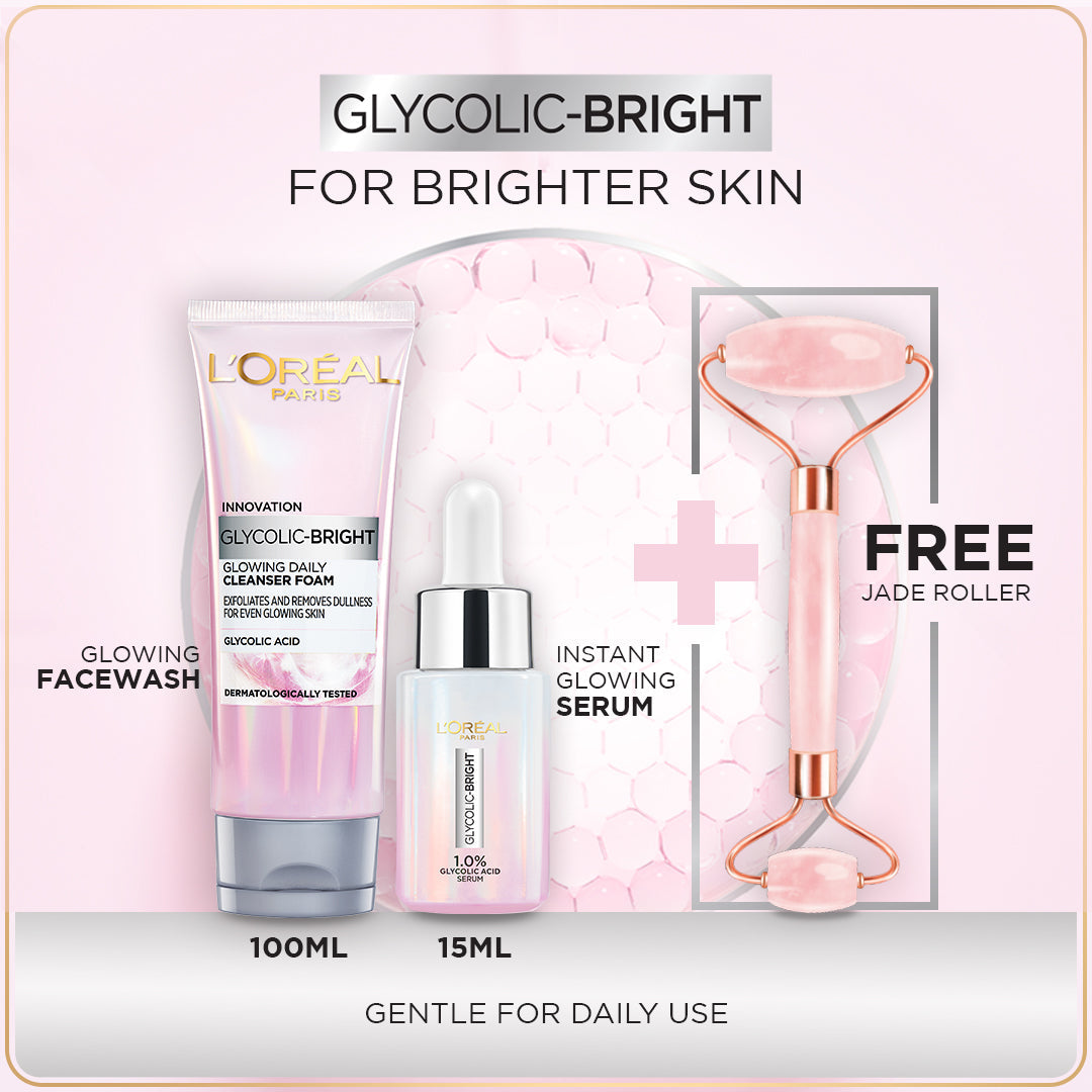 Bundle - L'Oreal Paris Glycolic Bright Instant Glowing Face Serum 15Ml + L'Oreal Paris Glycolic Bright Glowing Daily Face Wash 100ml with Free jade Roller