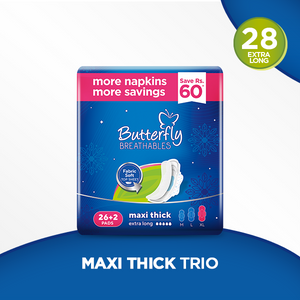 Butterfly Breathables Maxi Thick with Fabric soft top sheet is designed to give you maximum absorbency along with rash-free comfort with cottony wings.