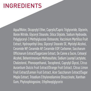 AQUA/WATER/EAU, DICAPRYLYL ETHER, CAPRYLIC/CAPRIC TRIGLYCERIDE, GLYCERIN, BORON NITRIDE, GLYCERYL STEARATE, SILICA SILYLATE, SODIUM HYDROXIDE, POLYGLYCERYL-3 METHYLGLUCOSE DISTEARATE, VACCINIUM MYRTILLUS FRUIT EXTRACT, HYDROXYETHYL UREA, GLYCERYL STEARATE SE, MYRISTYL ALCOHOL, CERAMIDE NP, CERAMIDE AP CERAMIDE EOP, CARBOMER, SACCHARUM OFFICINARUM EXTRACT/SUGARCANE EXTRACT/EXTRAIT DE CANNE A SUCRE, CETEARYL ALCOHOL, BEHENTRIMONIUM METHOSULFATE, SODIUM LAUROYL LACTYLATE, CHOLESTEROL, PHENOXYETHANOL, TOCOPHEROL, CAPRYLYL GLYCOL, CITRUS AURANTIUM DULCIS FRUIT EXTRACT/ORANGE FRUIT EXTRACT, CITRUS LIMON FRUIT EXTRACT/LEMON FRUIT EXTRACT, ACER SACCHARUM EXTRACT/ SUGAR MAPLE EXTRACT, TRISODIUM ETHYLENEDIAMINE DISUCCINATE, XANTHAN GUM, PHYTOSPHINGOSINE, ETHYLHEXYLGLYCERIN