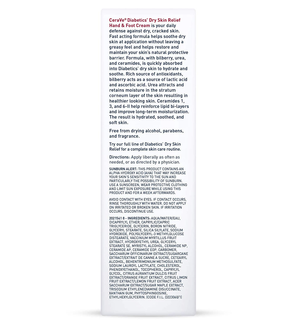 CeraVe Diabetics' Dry Skin Relief Hand and Foot Cream was developed with dermatologists to provide soothing, 48-hour hydration for diabetics’ dry skin. Formulated with three essential ceramides, urea and bilberry, our fragrance- and paraben-free moisturizer helps restore your skin’s barrier and attracts moisture to the skin. It is also formulated with patented MVE Technology for a steady of hydrating ingredients, and 95% of diabetic testers said their skin felt immediately smoother.