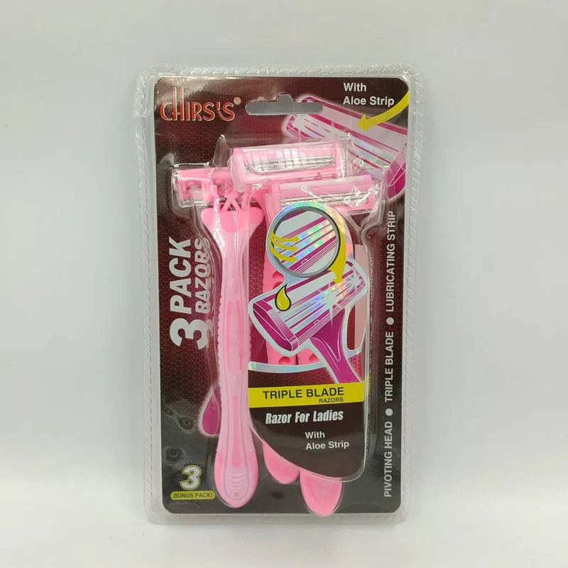 Chris's Triple Blade Razors with Aloe Strip for Ladies are designed to provide a smooth and comfortable shaving experience. These razors typically feature three sharp blades to ensure a close and precise shave with minimal irritation. The inclusion of an aloe strip adds a layer of lubrication and soothing effect, helping the razor glide smoothly over the skin and reducing the chances of nicks and cuts.