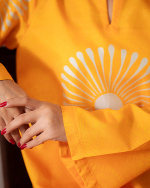 THIS MUSTARD KURTA IS METICULOUSLY DESIGNED IN RAW SILK, FEATURING A SELF-PRINT LONG SHIRT PAIRED WITH WIDE-LEG TROUSERS