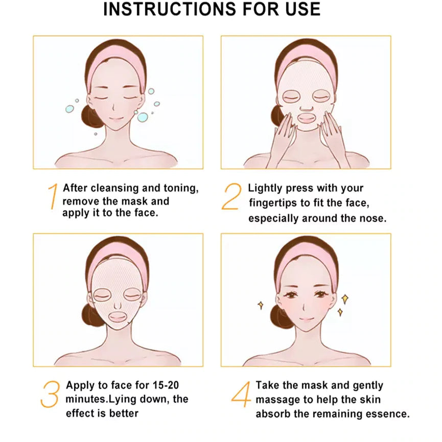 How To Use : Clean skin and remove mask from packaging. There is total 2 layers of face mask, take down the white pearl film, spread the silk mask out and apply carefully onto the face, resting on the face for 15-20 minutes. Take off the mask and gently pat the face. Excess serum can be applied to neck, shoulders and hands. Face sheet to be used only once. Access gel serum in package can also be used as a serum the following days before moisturizer.