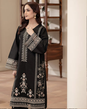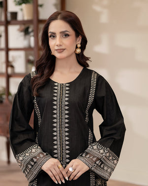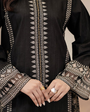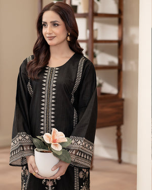 This exquisite Daily/Basic Wear Kurta Set is a winter wardrobe essential. The Straight Cut Kurta in luxurious Cotton Satin features intricate embroidered detailing. Paired with a classic Straight Trouser in comfortable Cotton fabric, this 2-piece set in sleek Black exudes elegance. Elevate your everyday style with this wardrobe staple from Flutterby.