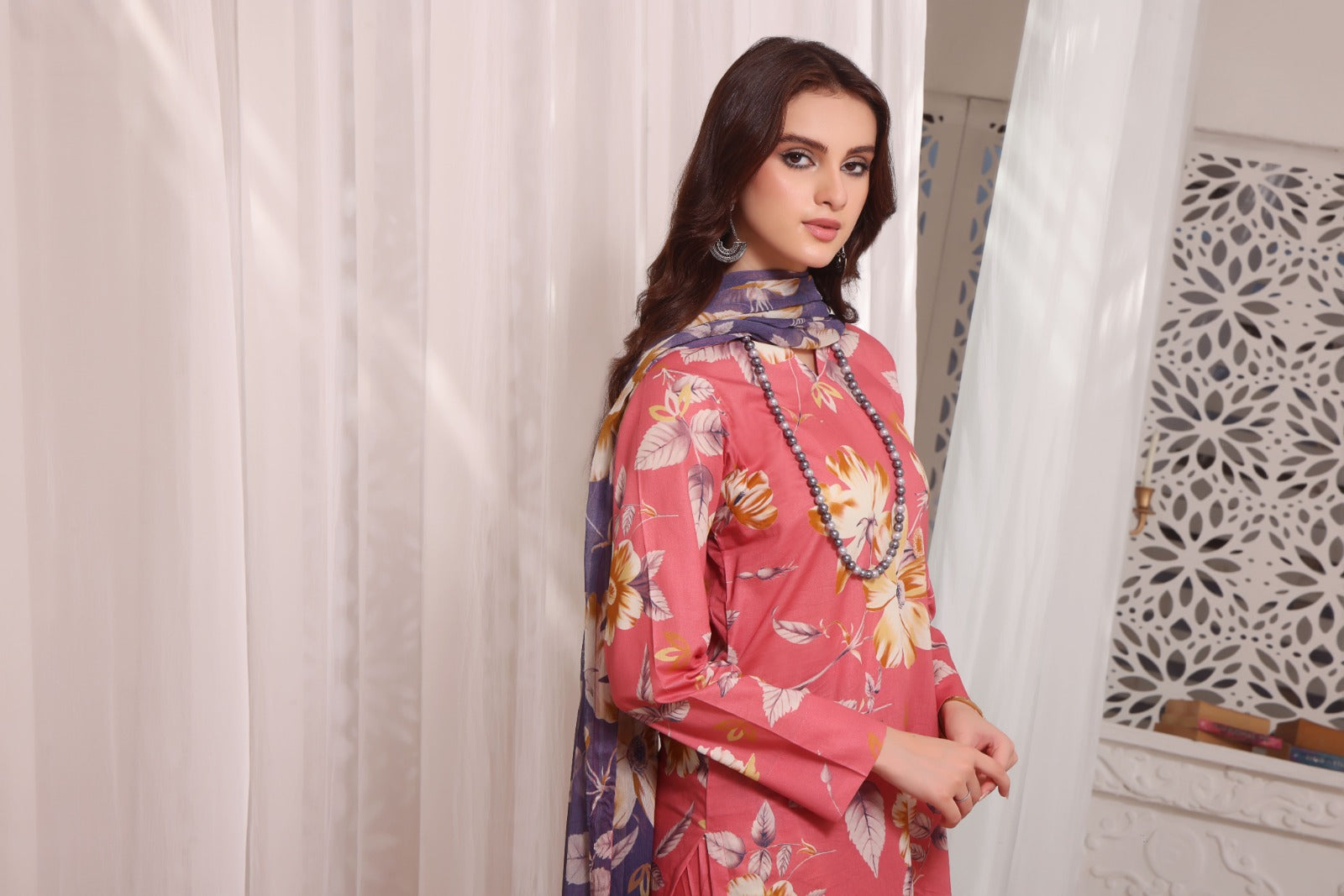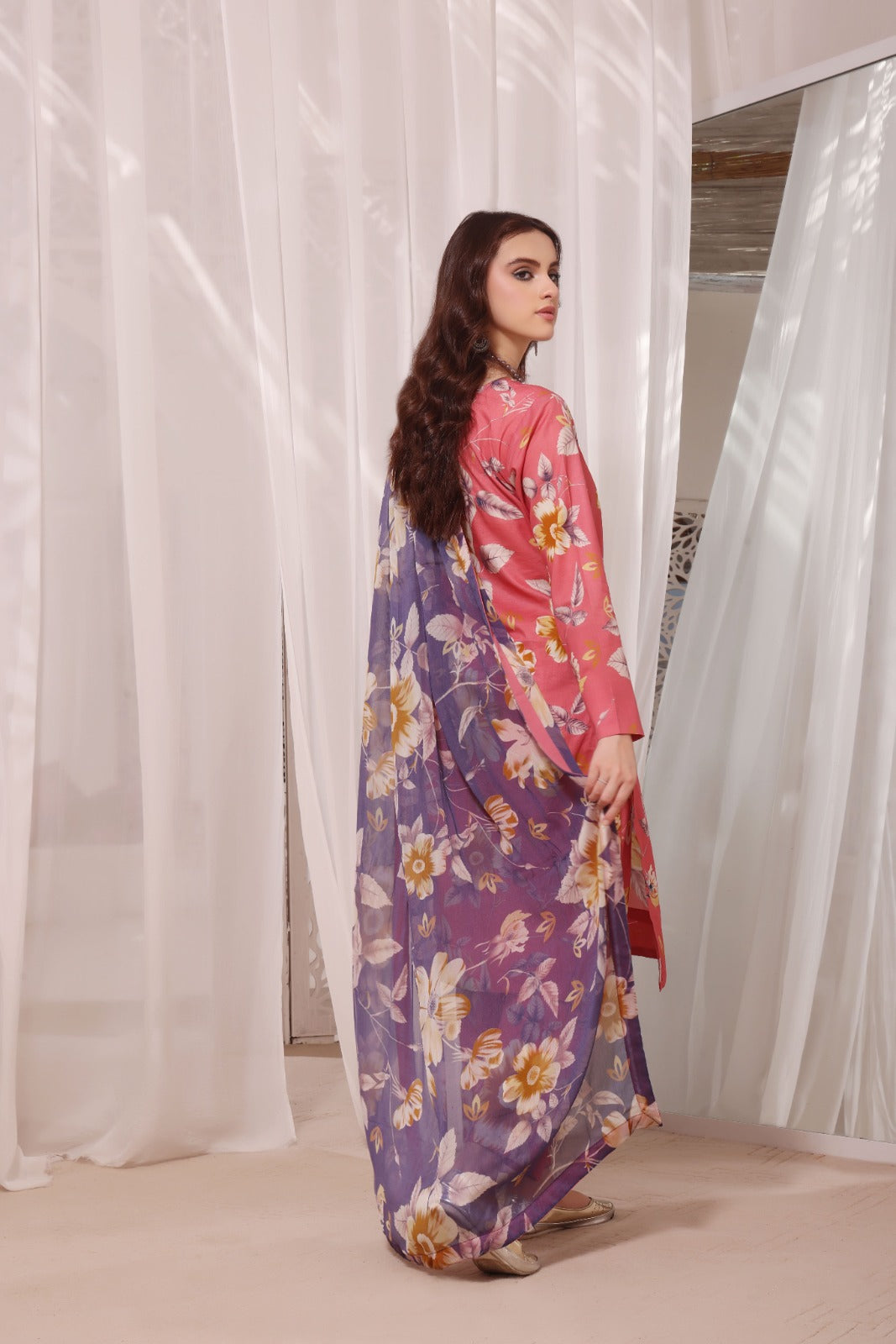 The article includes:Unstitched 3PCDigital Printed Shirt 3 yardsDigital Printed Chiffon Dupatta Digital Printed Trouser 2.5 yards