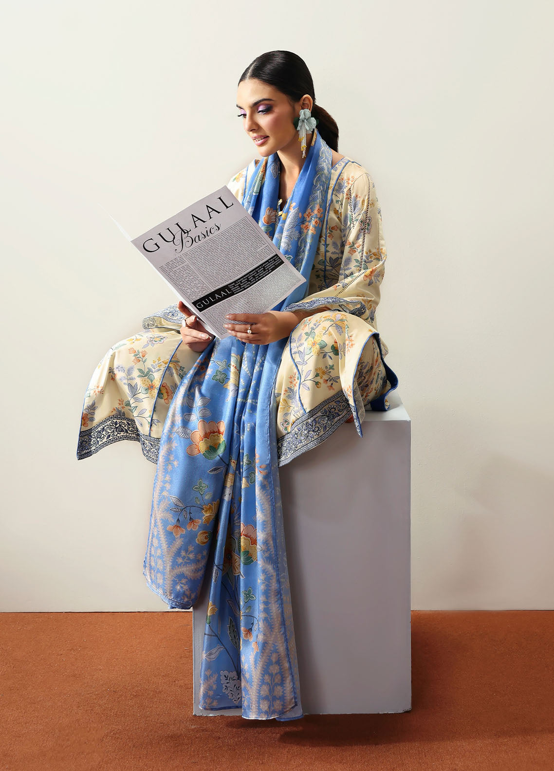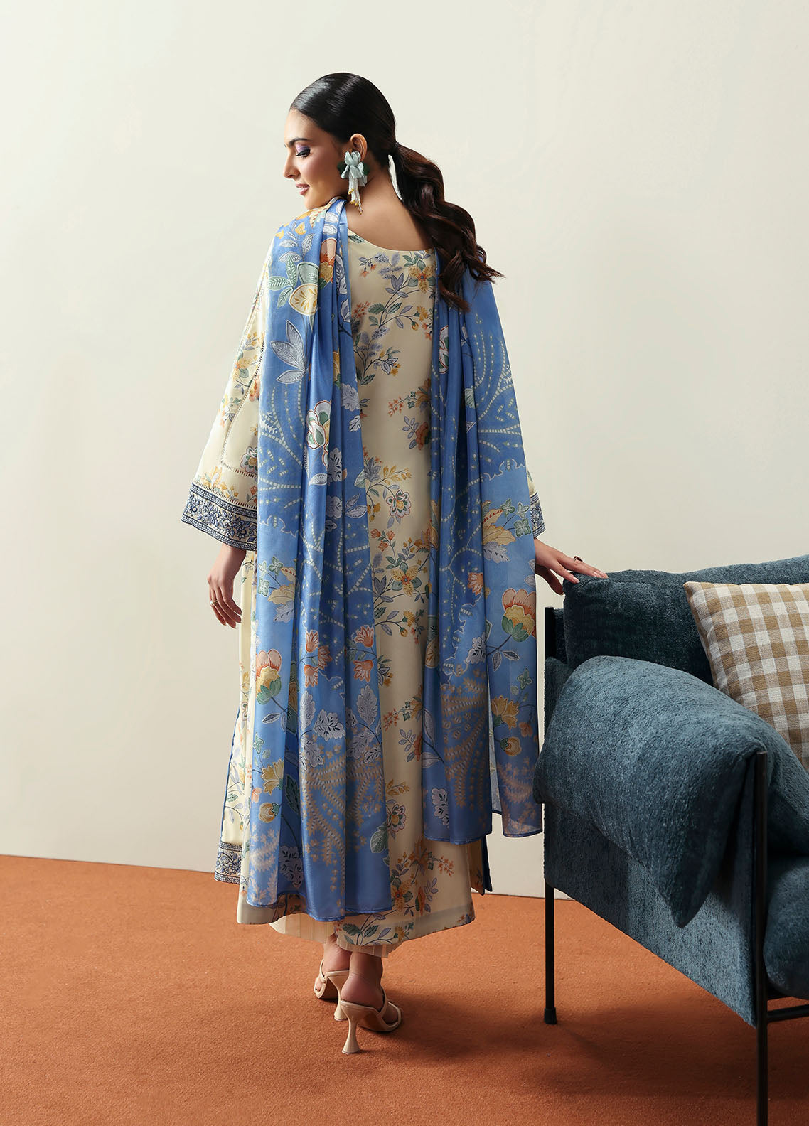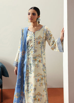 Soft and sophisticated, Elaris is crafted in a delicate pale butter yellow hue that radiates quiet elegance. The A-line shirt features beautifully embroidered organza borders on the front and sleeves, adding graceful dimension to the silhouette. A two-toned chatta patti trim lends a subtle yet striking contrast to the overall design. Paired with a printed silk dupatta and a comfortable plain poly lawn trouser, this ensemble beautifully blends tradition with modern charm.