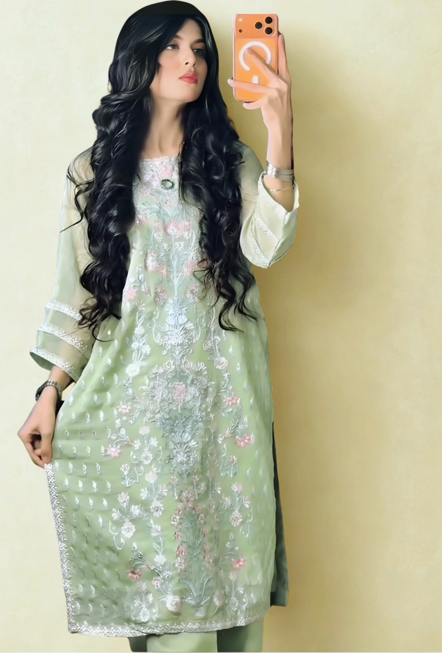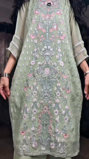 Paired with a smooth viscose trouser, this ensemble ensures effortless wear throughout the day, offering a soft drape and comfortable fit. The subtle pastel green color makes it an ideal choice for daytime gatherings, festive lunches, or elegant casual wear.