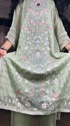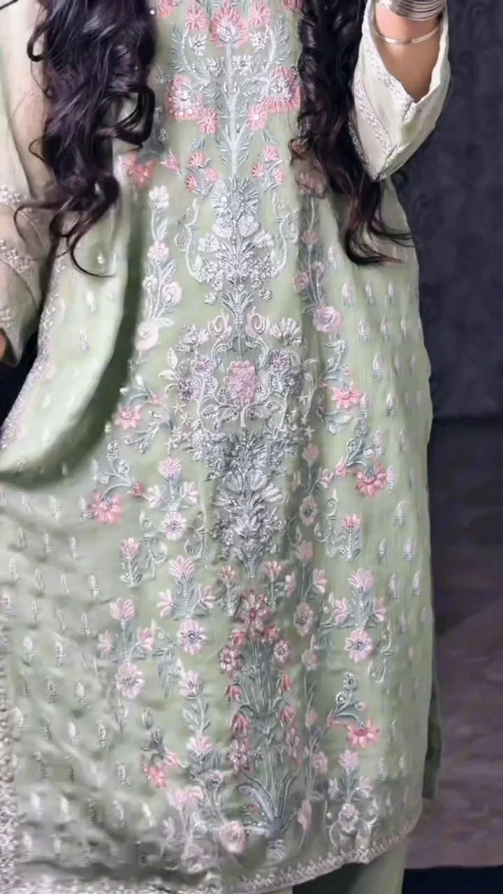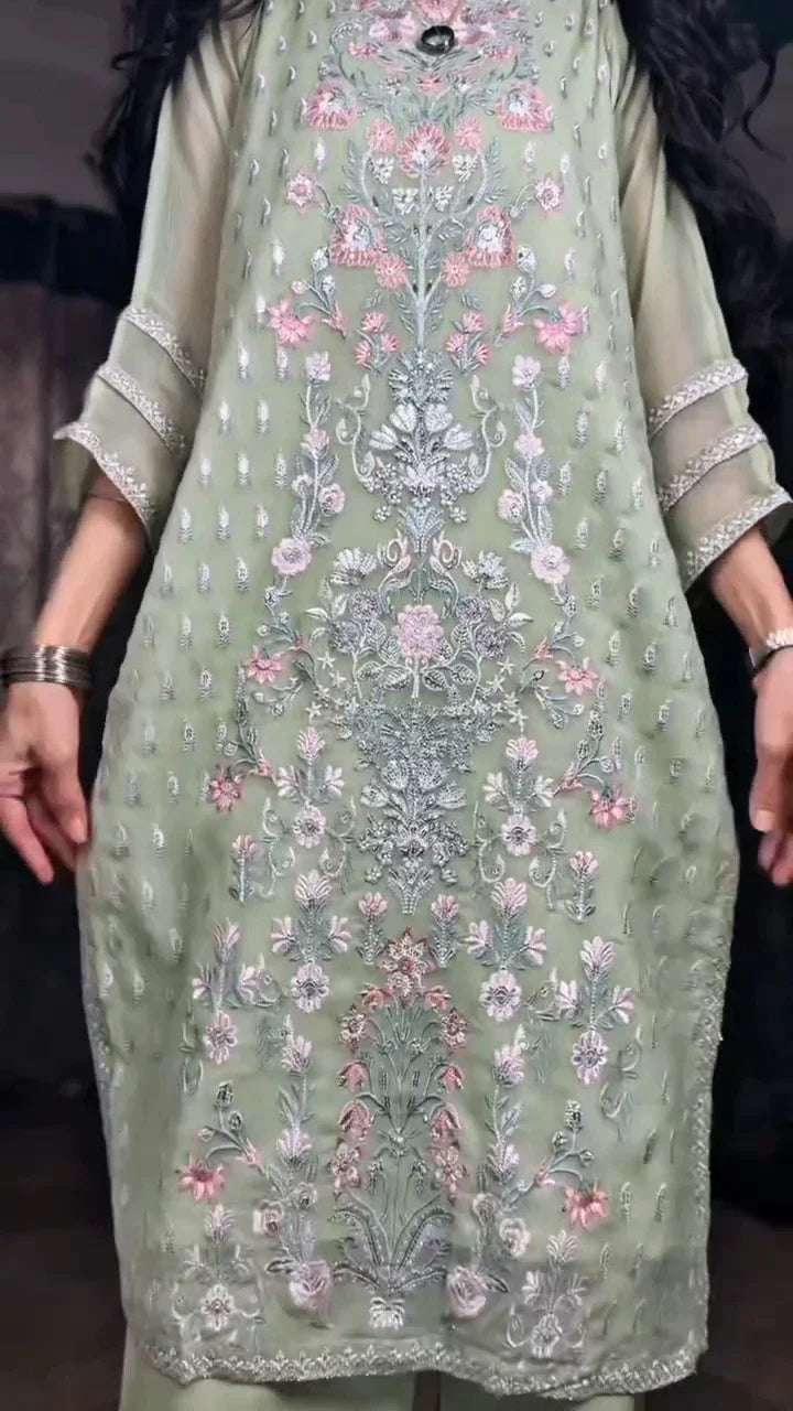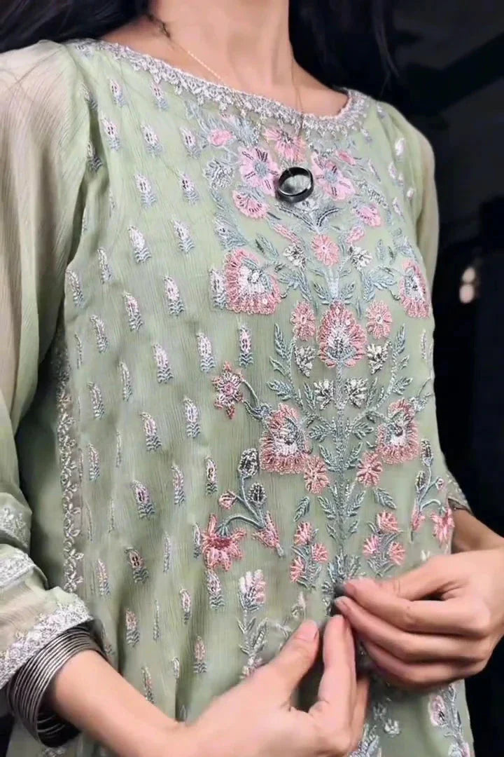 Elevate your everyday and semi-formal wardrobe with this elegant 2-piece stitched suit, crafted with a perfect balance of grace and comfort. The shirt is made from original chiffon, featuring delicate all-over embroidery in soft pastel tones that adds a refined, feminine charm. Intricate floral detailing on the front panel enhances the luxurious appeal while keeping the look light and breathable.