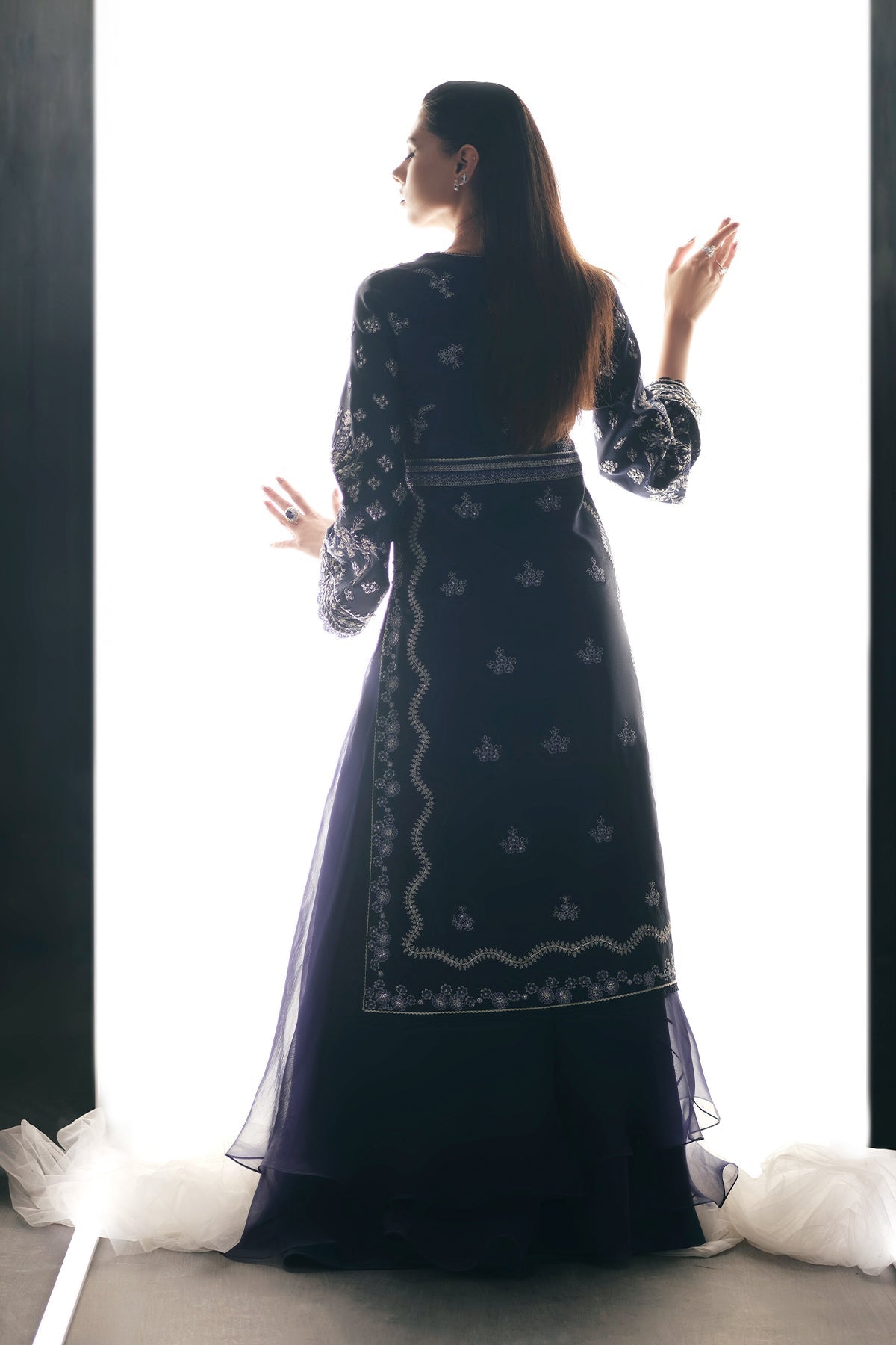Esra is the perfect blend of elegance and craftsmanship. The luxurious silk shirt features intricate thread work, shimmering sequins, and Cut Dana embellishments, adding depth and texture. Paired with a flowing organza sharara and a delicate organza dupatta, this ensemble radiates grace and sophistication. Esra is the ideal choice for those who appreciate timeless beauty and exquisite detailing.