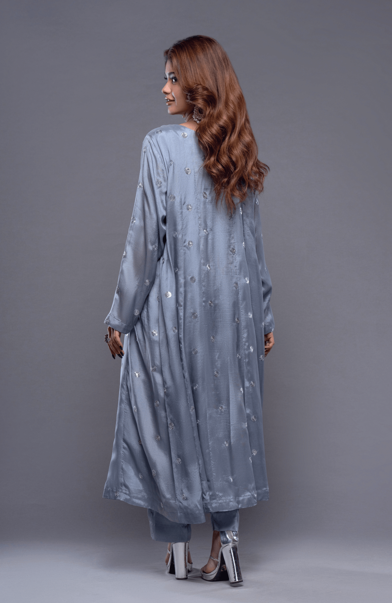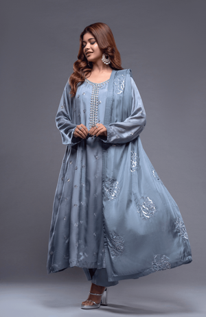 This paneled shirt, finely embellished with stones and sequins, radiates elegance. The dupatta, featuring a unique flower-pattern embroidery, adds a catchy and captivating touch. With its silky texture, this ensemble ensures you look effortlessly graceful and chic.