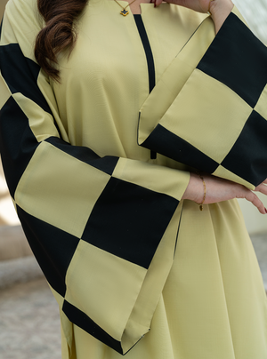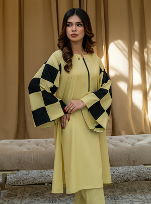 This lemon-hued outfit showcases flawless craftsmanship with precise patchwork and impeccable tailoring. Featuring a sleek shirt with minimal black sleeve detailing, it embodies simplicity and modernity - Limited Edition!