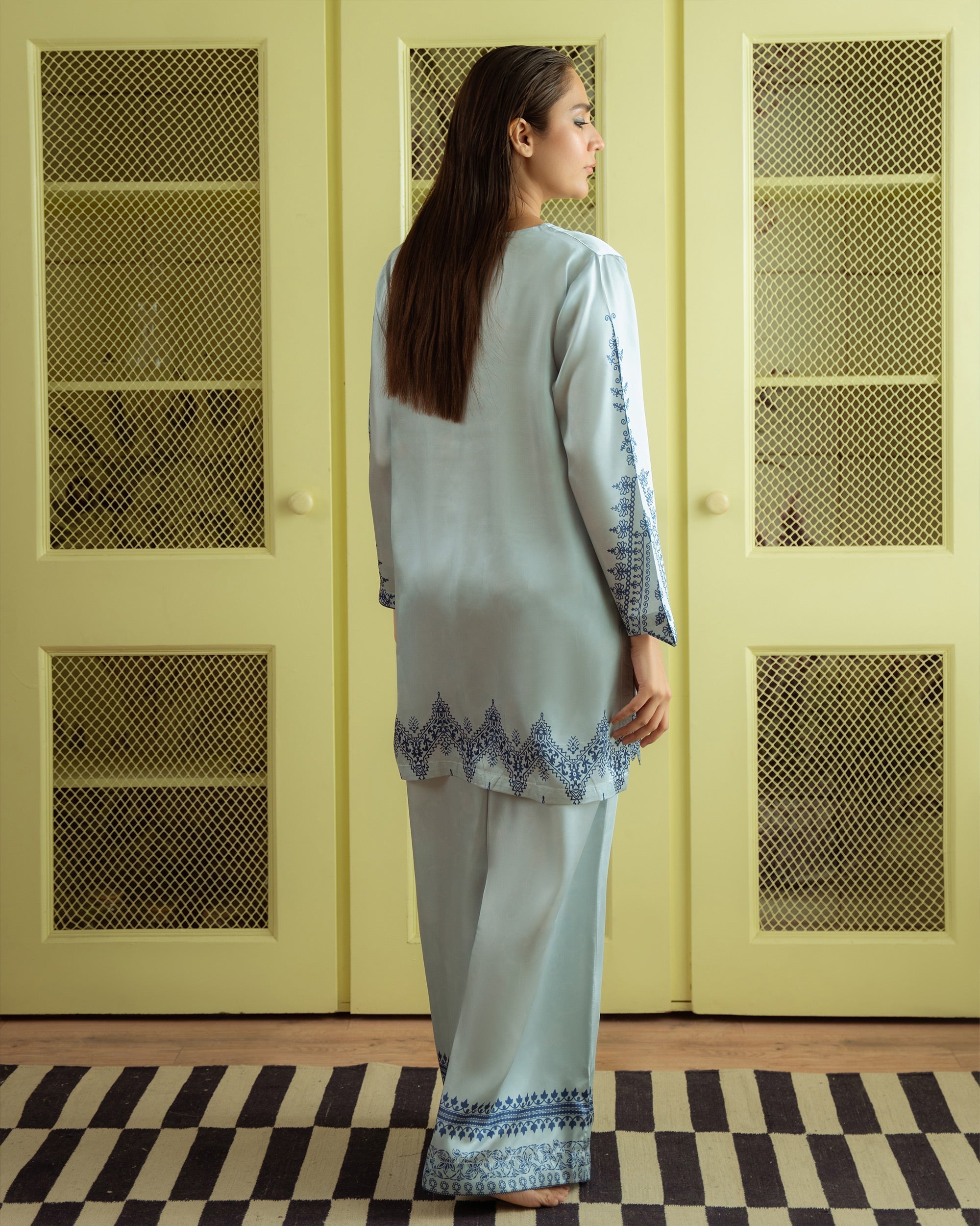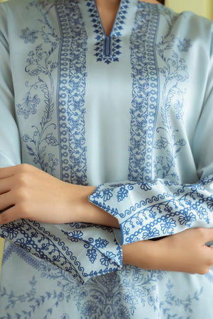 Jaleh is a stunning blue on blue print printed silk set, featuring a short shirt and wide-leg pants. This piece is crafted to enhance the richness of your entire look.