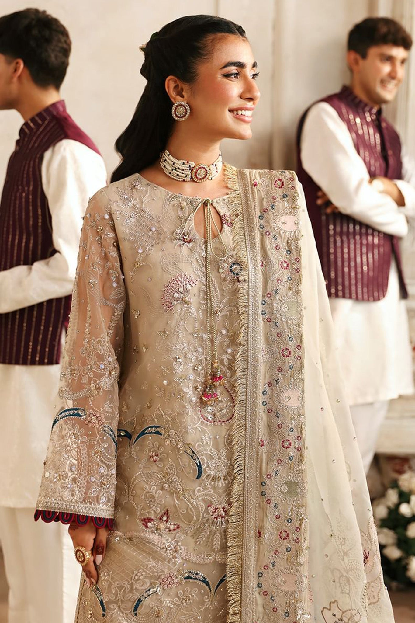 • Embroidered organza sleeves with hand embellishment