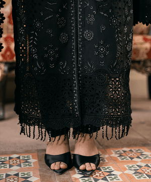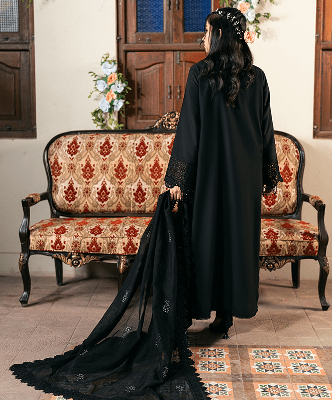 Kaali Ghataa is a classic black piece that exudes timeless sophistication. The beautifully embroidered kameez is paired with matching trousers and a sheer dupatta, creating an alluring look. Perfect for evening wear, this suit blends tradition with modern elegance for a striking yet graceful presence