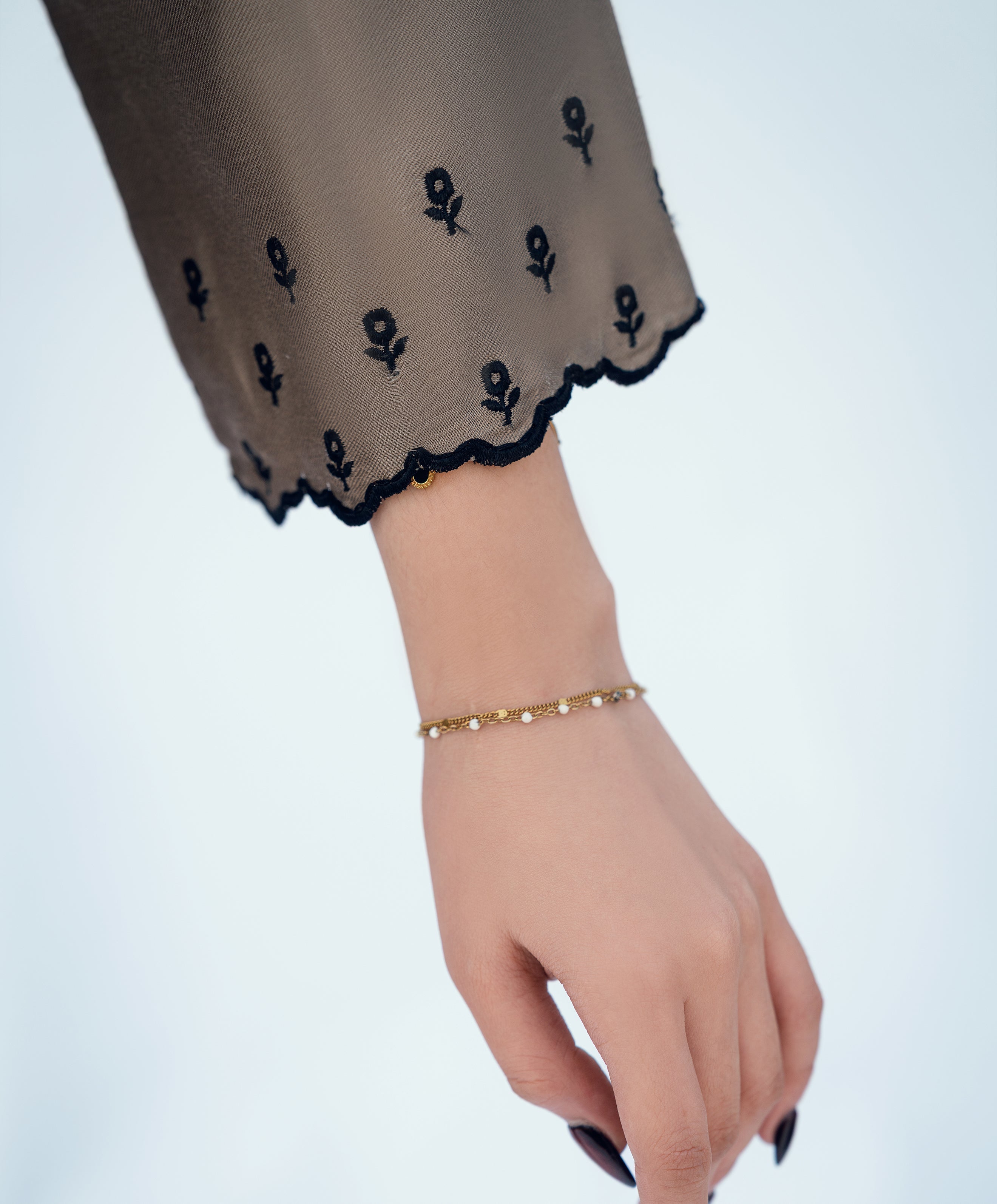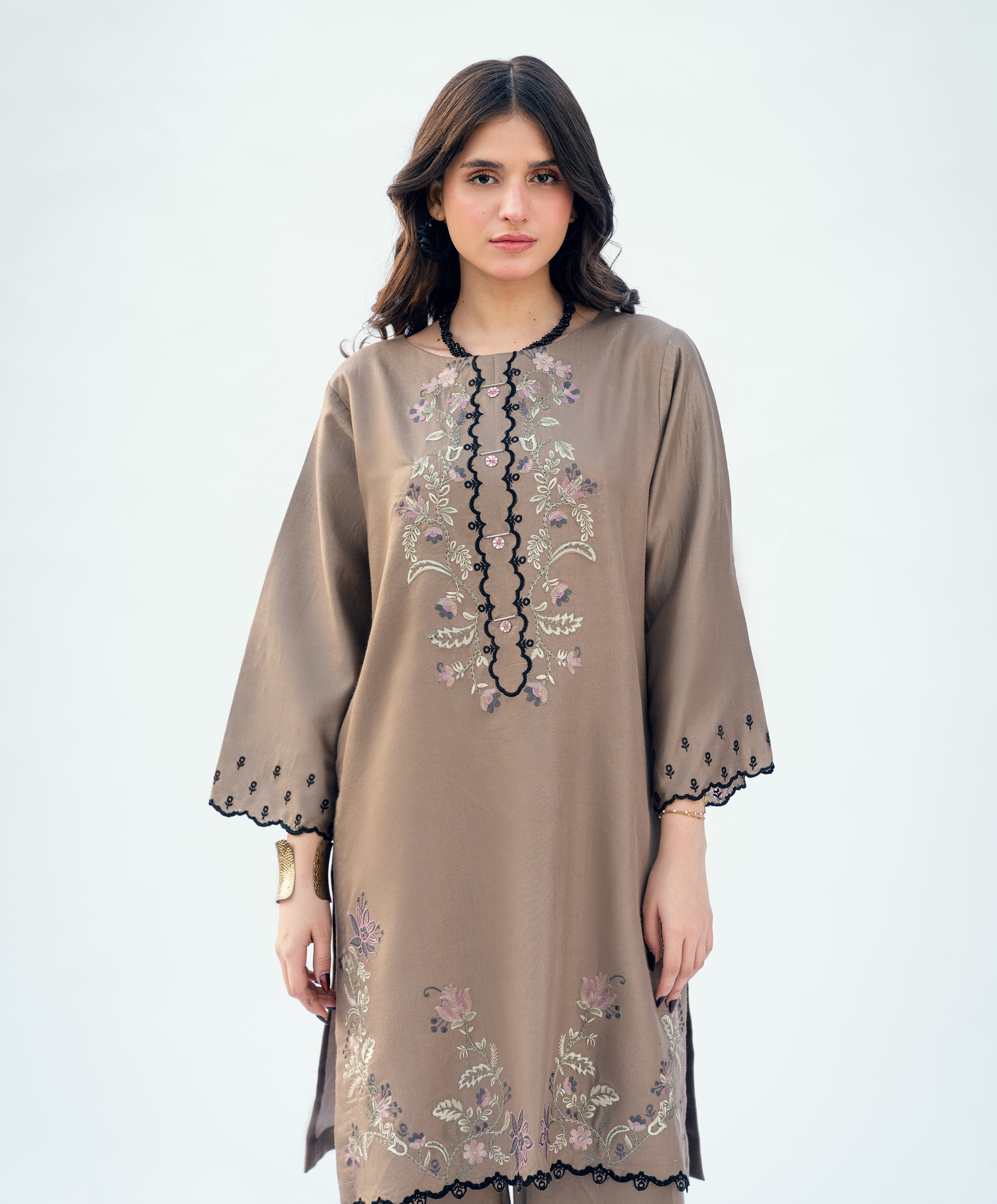Champagne-colored embroidered 2-pc set in pure twill voscose. Multi coloured embroidery in winter tones with satin and mystery kaanthaa stitch. Short shirt with wide legged pants