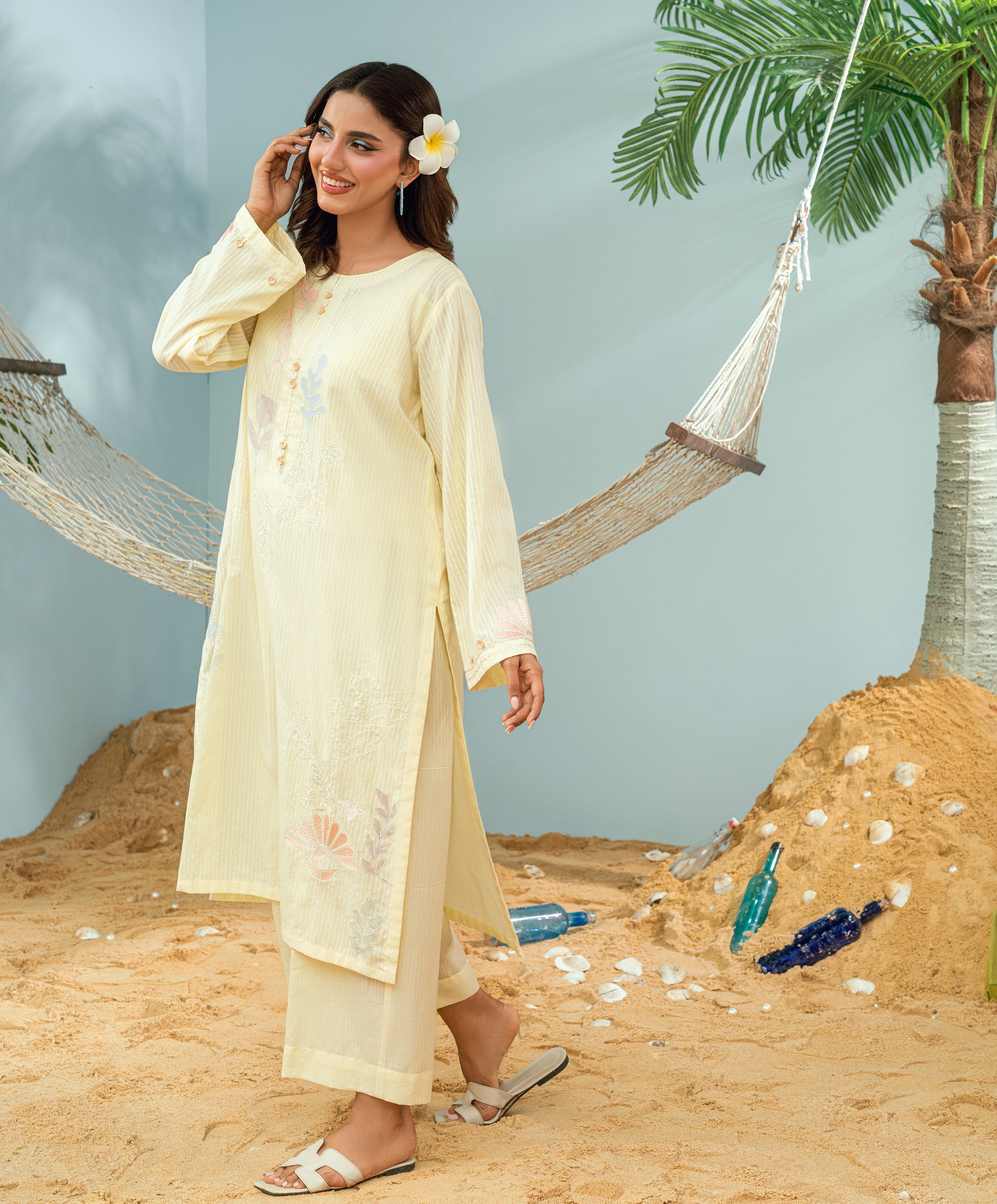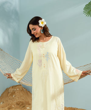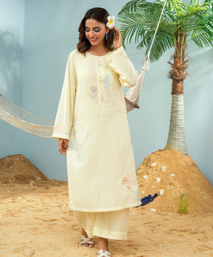 Crafted on breathable dori lawn, this co-ord set showcases linear embroidery and playful contrasting patchwork. Our signature Kaanthaa stitch is carefully incorporated into the design —adding depth and artistry. Presented in Yellow, it’s a standout piece from our Monsoon Collection, designed to reflect the vibrant, refreshing spirit of the season.