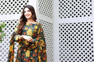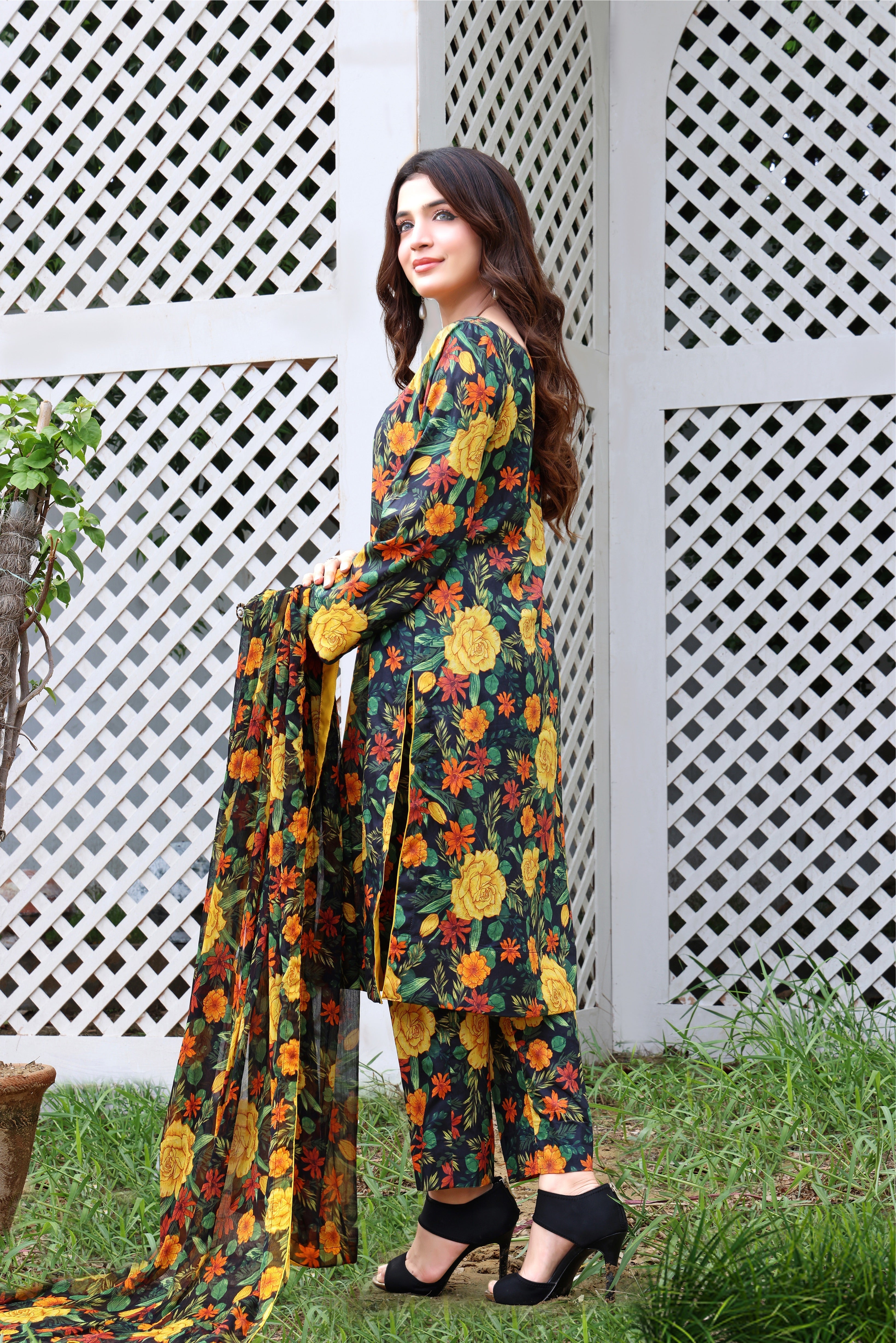 The article includes:Unstitched 3PCDigital Printed Shirt 3 yardsDigital Printed Chiffon Dupatta Digital Printed Trouser 2.5 yards