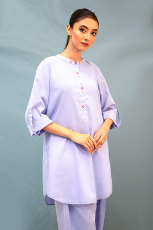 Fashionably indulge in your daily activities with this crisp lavender shirt & trouser adorned with colorful resham handwork.