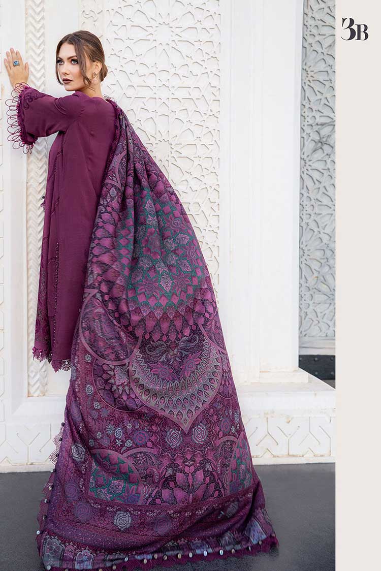his dress is a fine artistry of refinement; featuring meticulous embroidery that seamlessly blend into pink canvas and paired with printed shawl and dyed trousers for ultimate style statement.