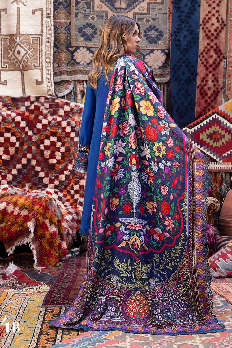 his dress is a fine artistry of refinement; featuring meticulous embroidery that seamlessly blend into pink canvas and paired with printed shawl and dyed trousers for ultimate style statement.