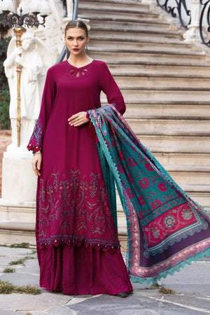 his dress is a fine artistry of refinement; featuring meticulous embroidery that seamlessly blend into pink canvas and paired with printed shawl and dyed trousers for ultimate style statement.