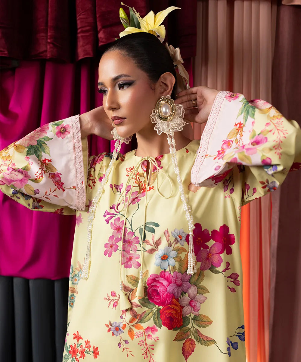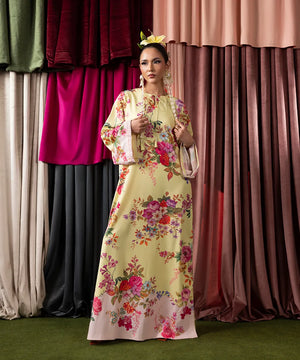 Wrap yourself in beauty in this stunning butter-yellow kaftan, crafted in crepe with a contemporary floral print featuring pink and rust rose bouquets.