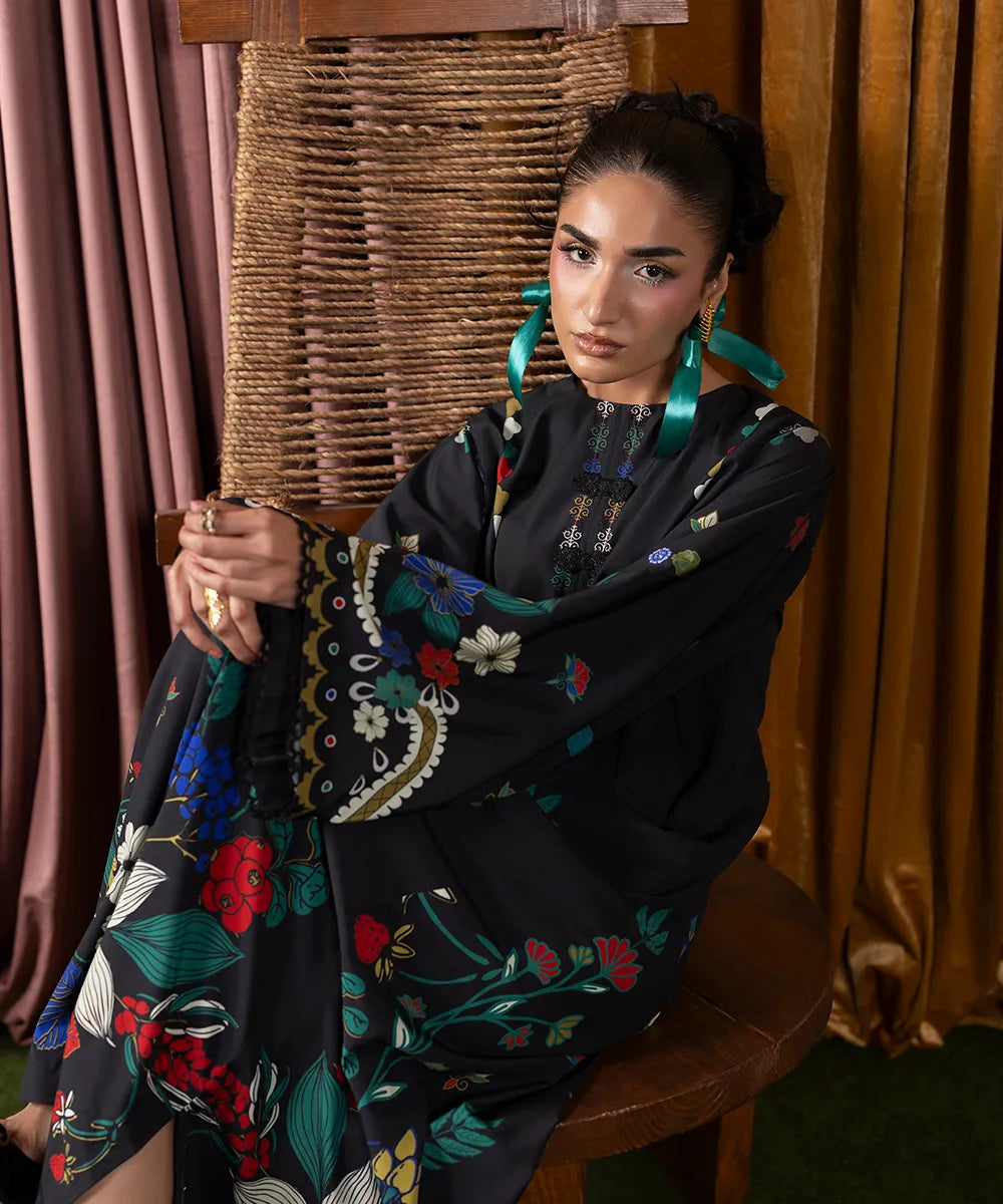 Embrace the beauty of this stunning black kaftan crafted in crepe with a contemporary Suzani print featuring lovely florals, meticulously woven like a poem in multi-colors.